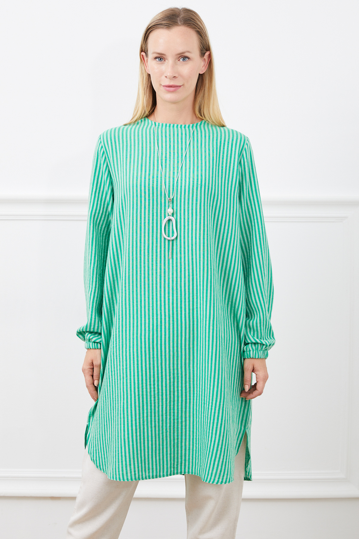 Kolları Lastikli Çizgili Tunik-Yeşil