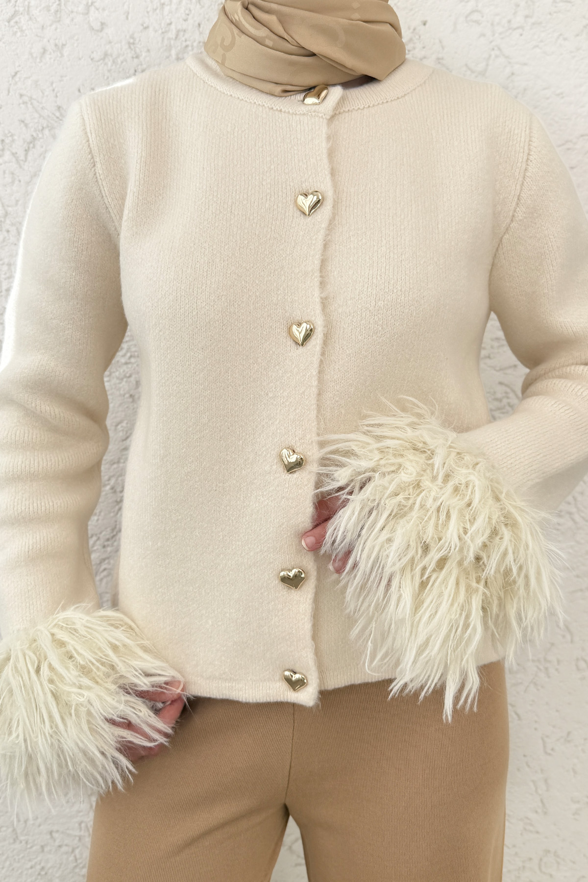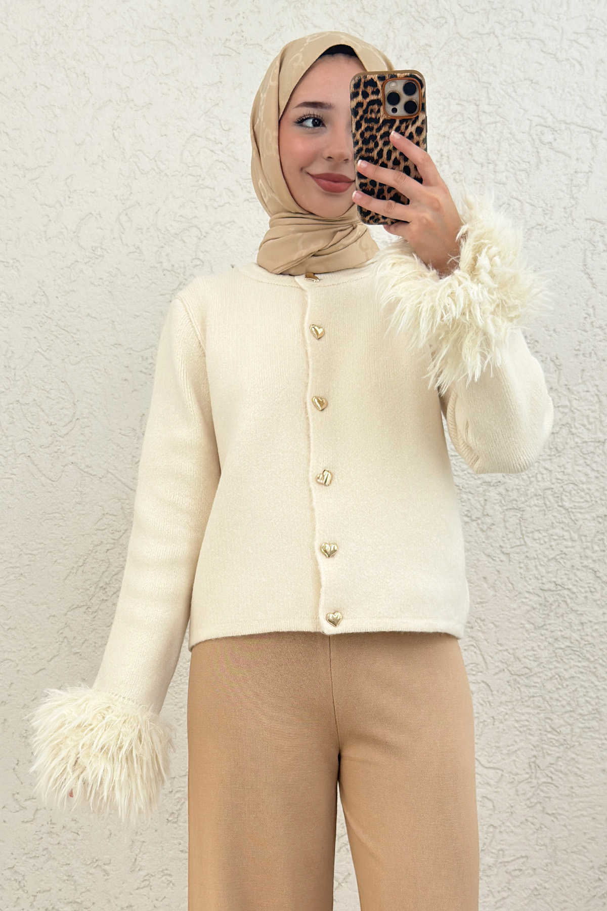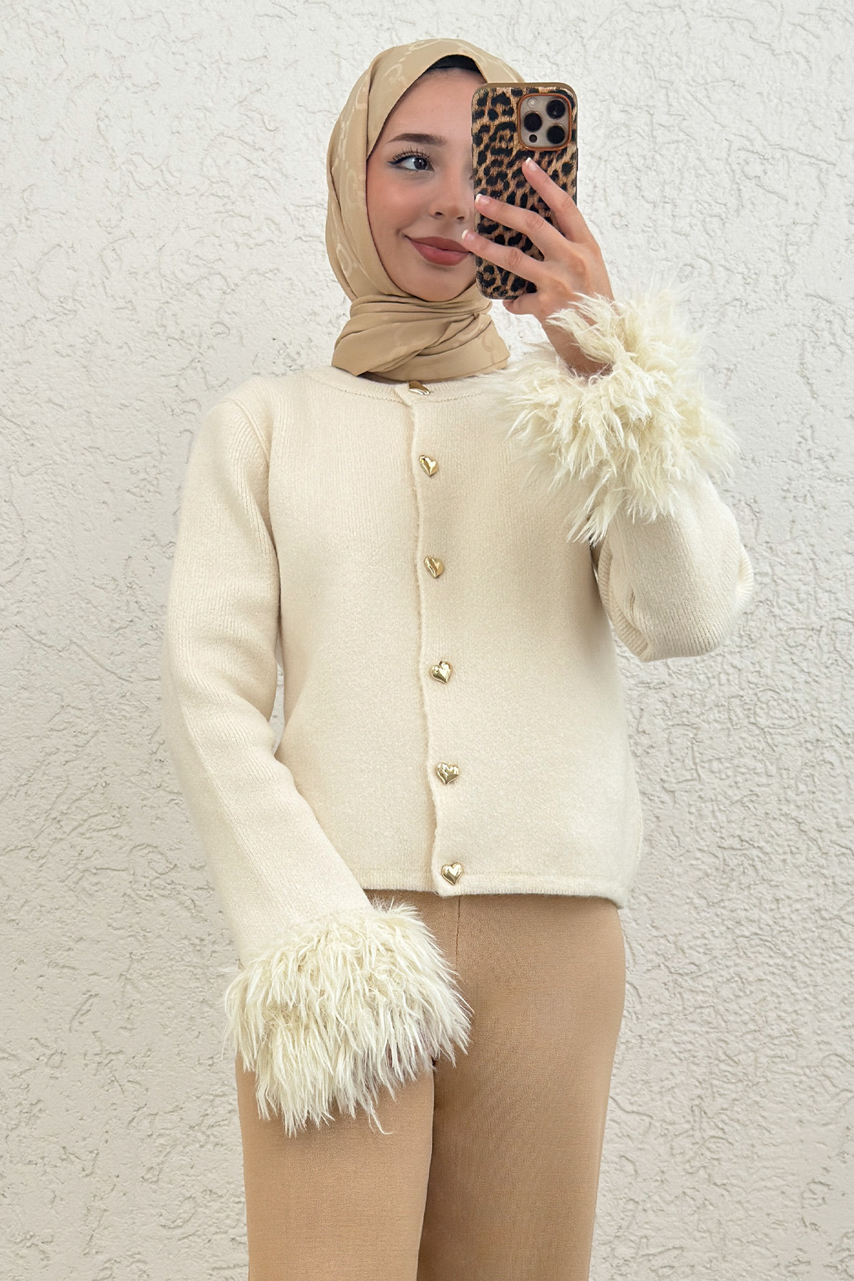 Kolları Püsküllü Triko Hırka TR-7380 - EKRU-Ekru