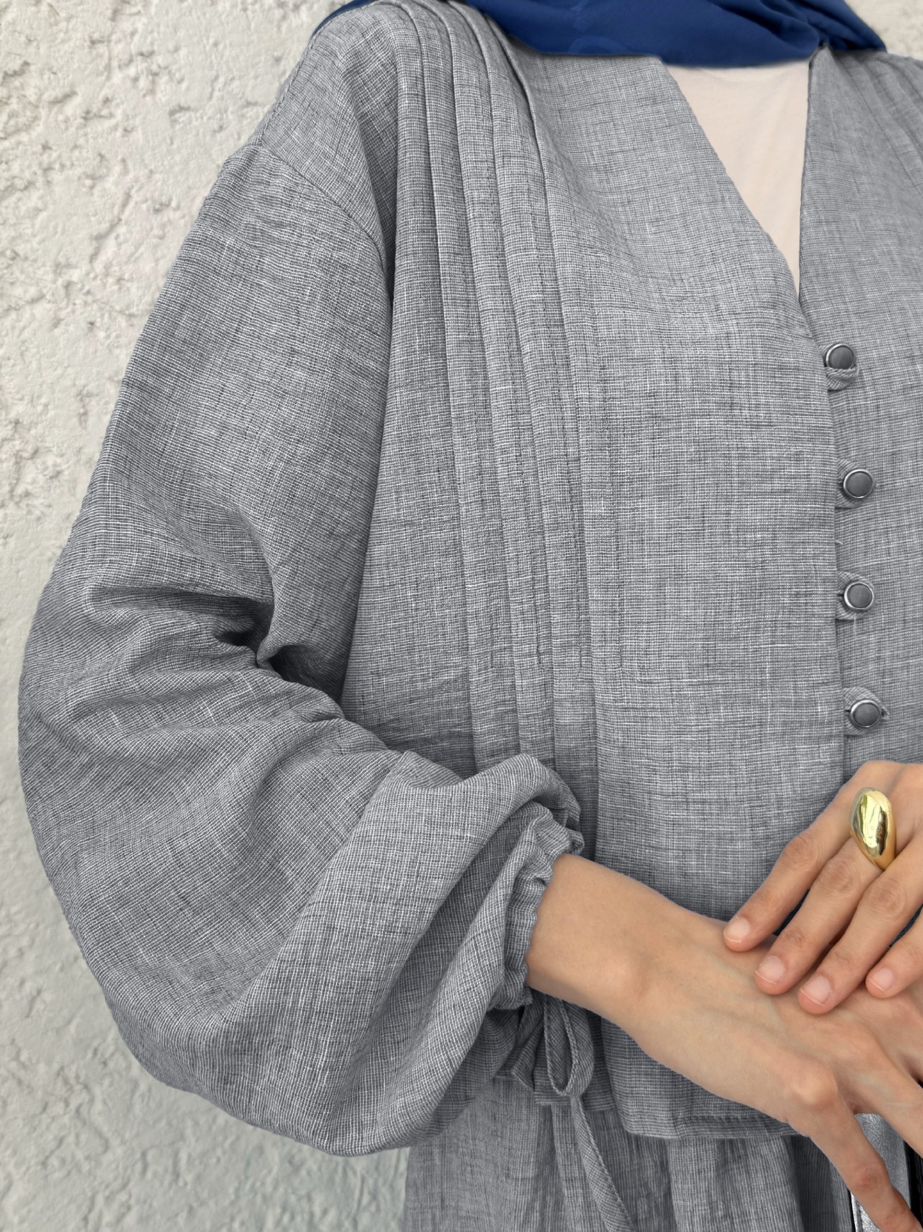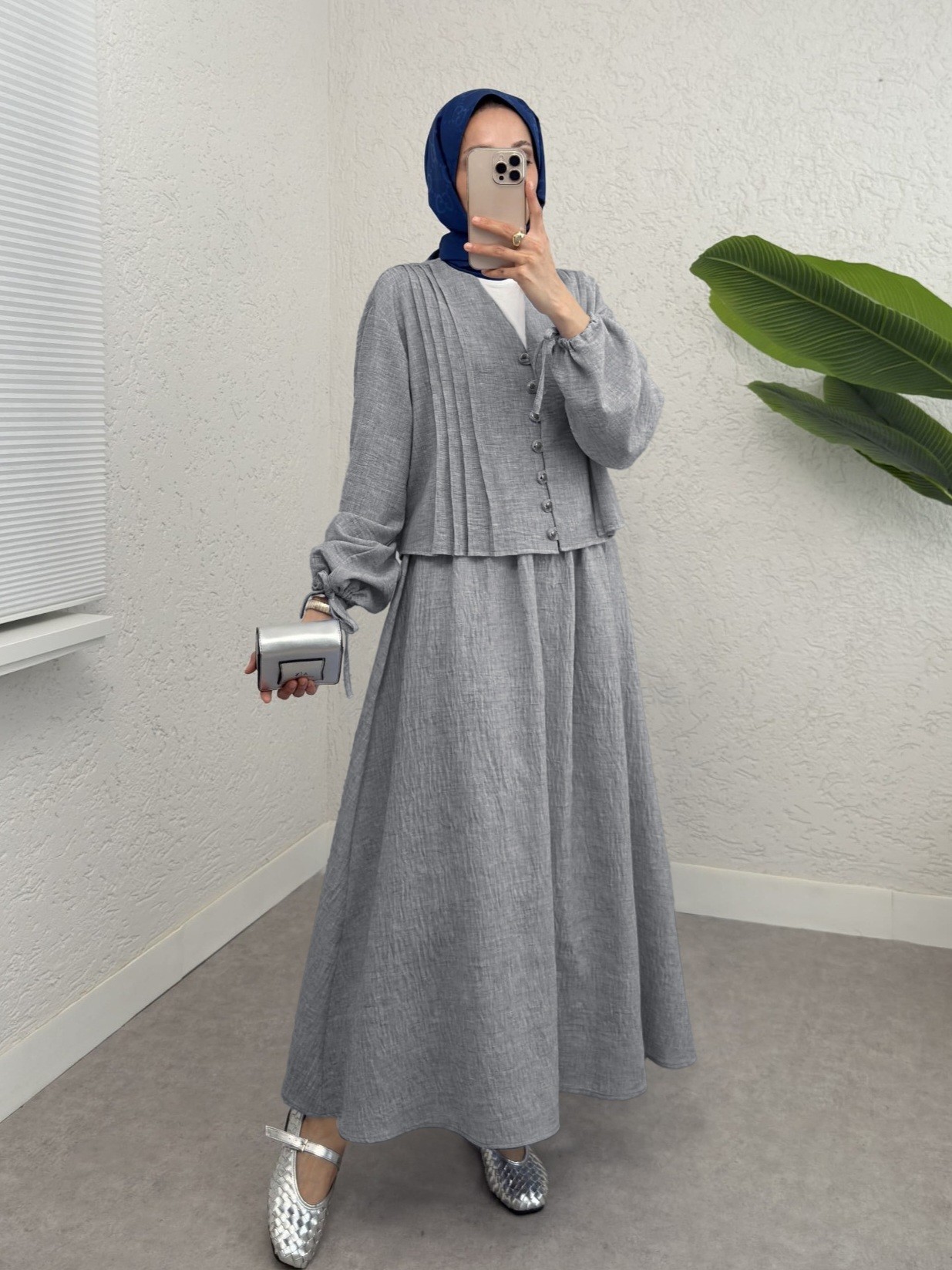 Kolu Bağlamalı Önü Düğmeli Etekli Takım -Füme-Füme