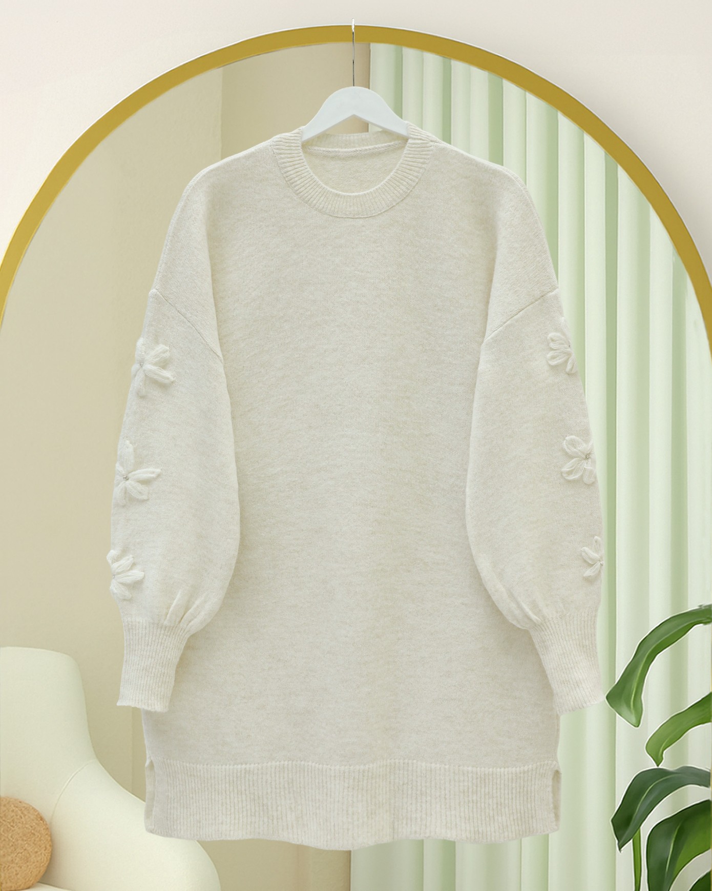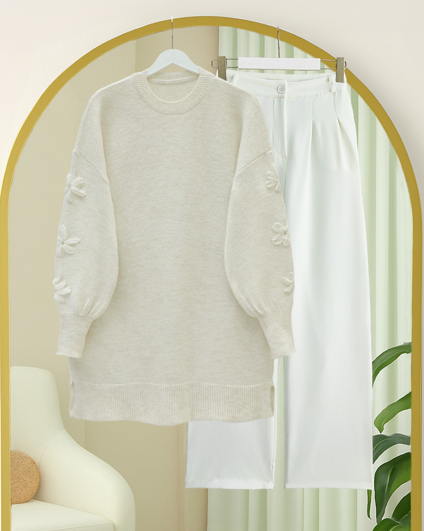 Kolu Çiçek Detaylı Yuvarlak Yaka Yumoş Triko Kazak -Ekru-Ekru