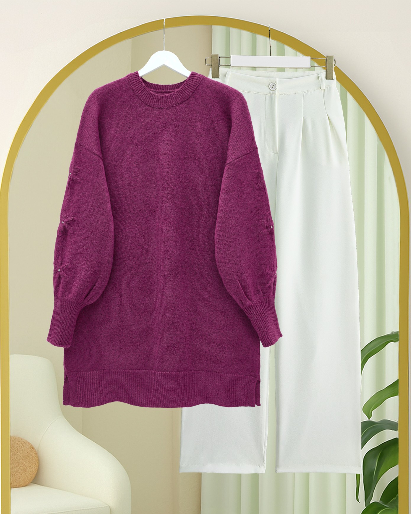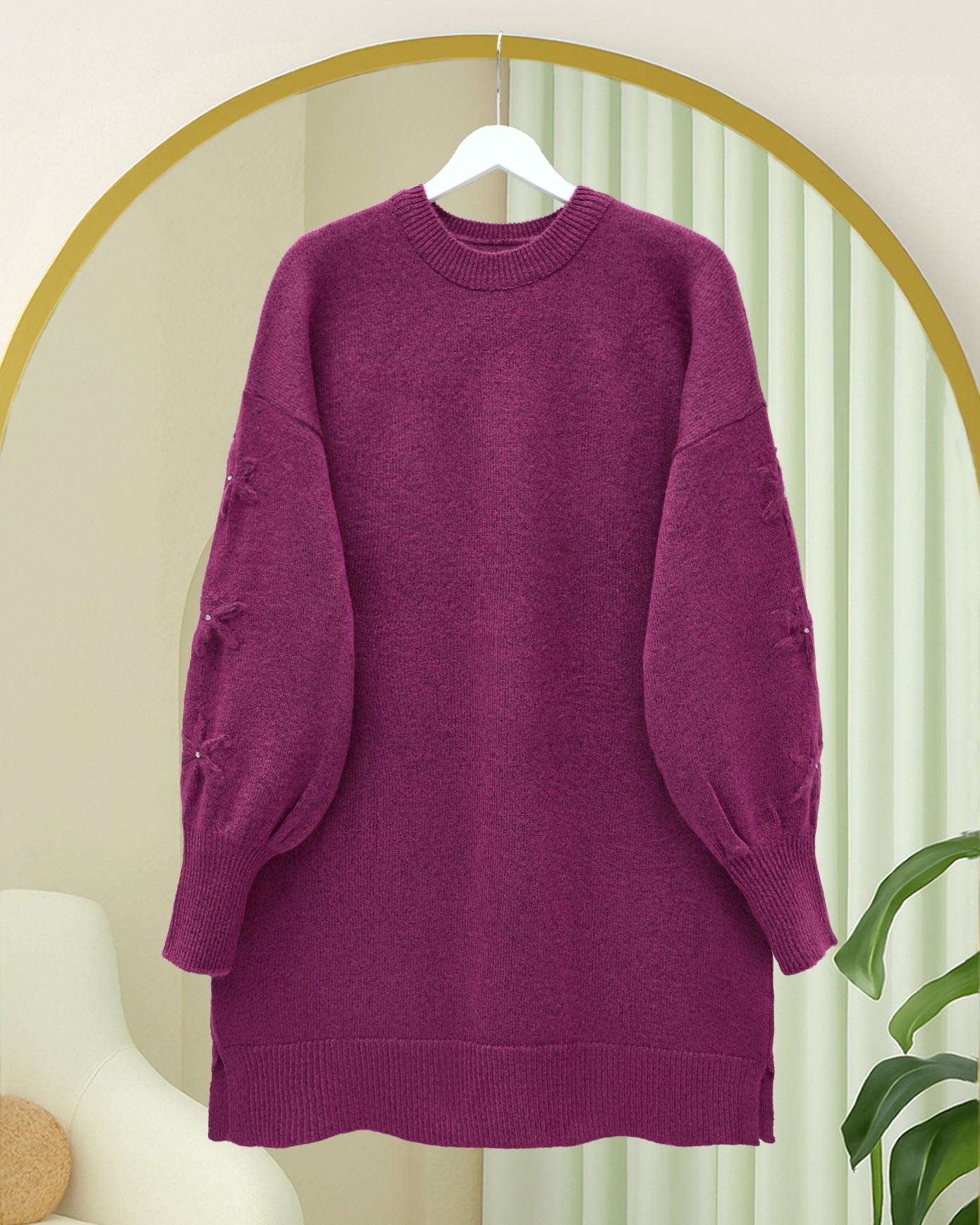 Kolu Çiçek Detaylı Yuvarlak Yaka Yumoş Triko Kazak -Fuşya-Fuşya