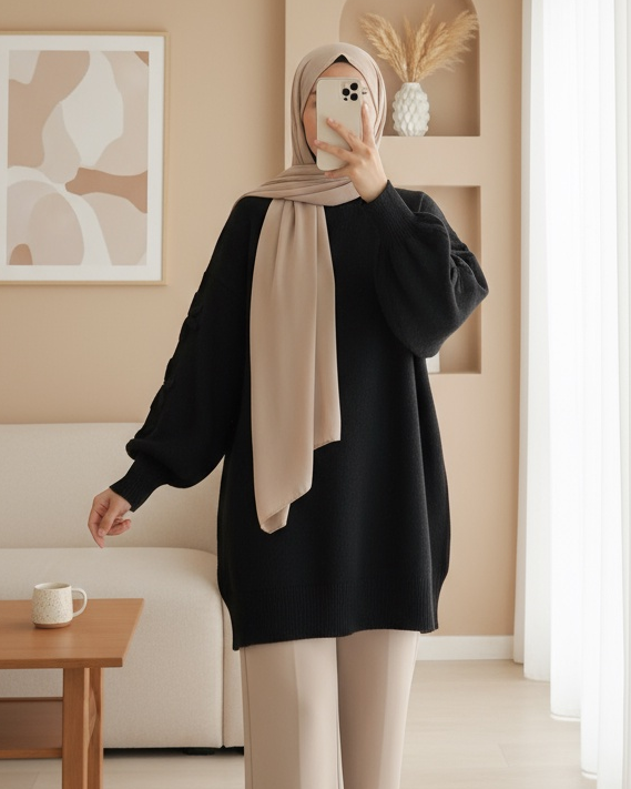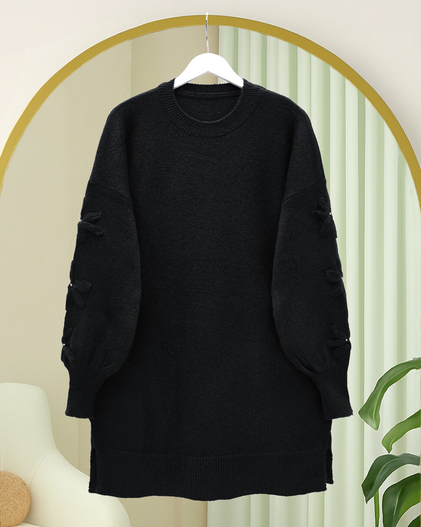 Kolu Çiçek Detaylı Yuvarlak Yaka Yumoş Triko Kazak -Siyah-siyah