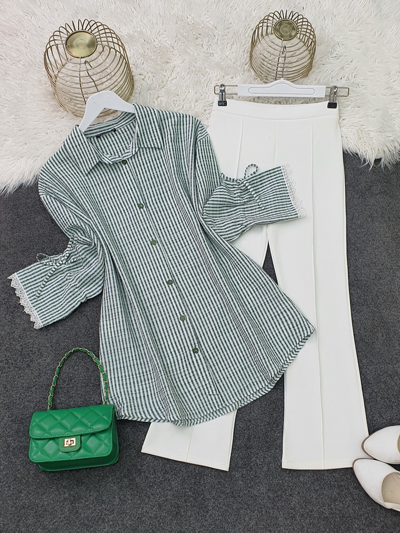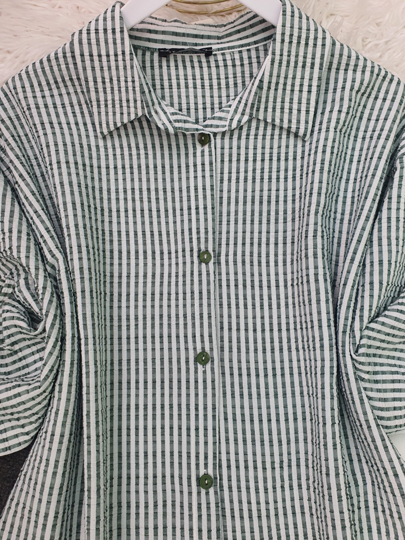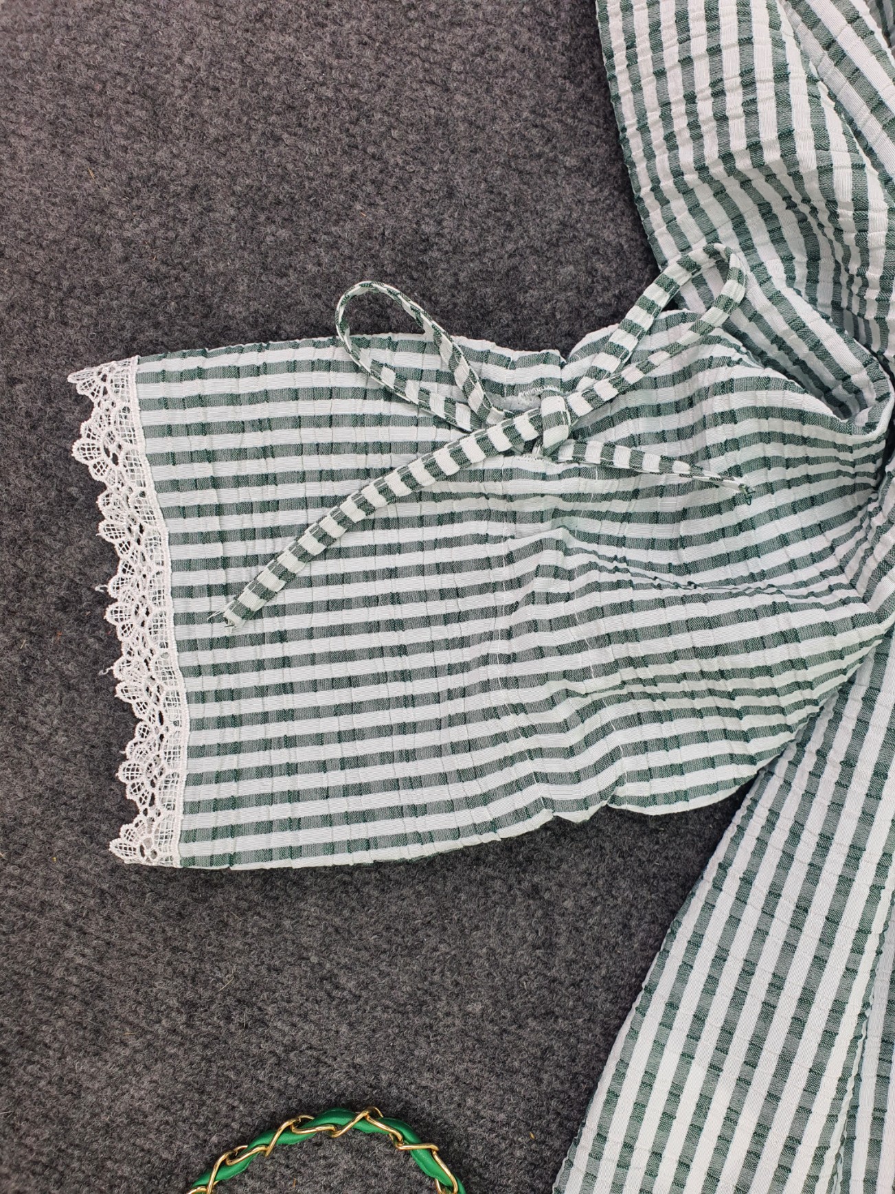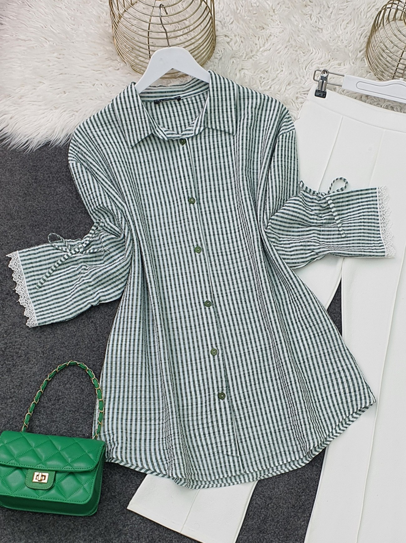 Kolu Dantelli Bağcıklı Çizgili Gömlek -Haki-Haki