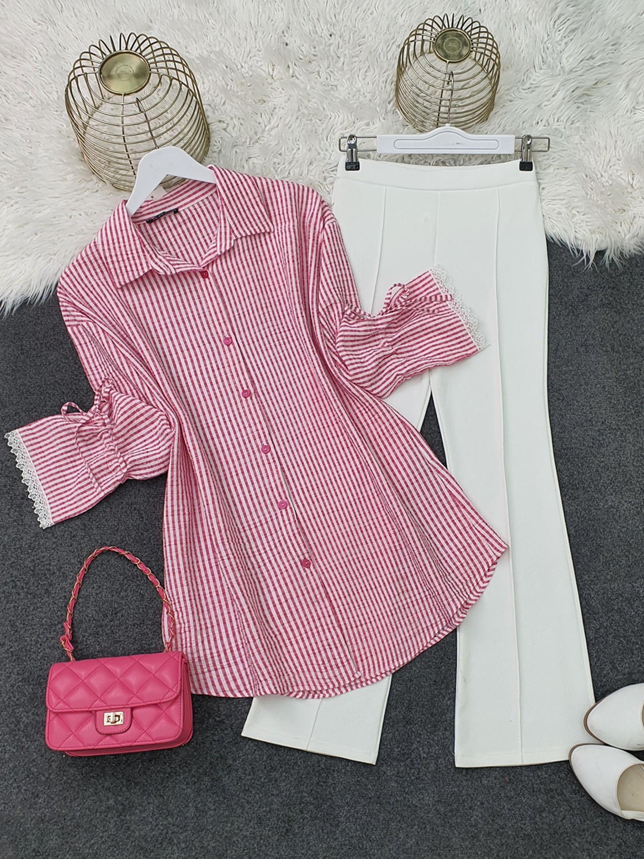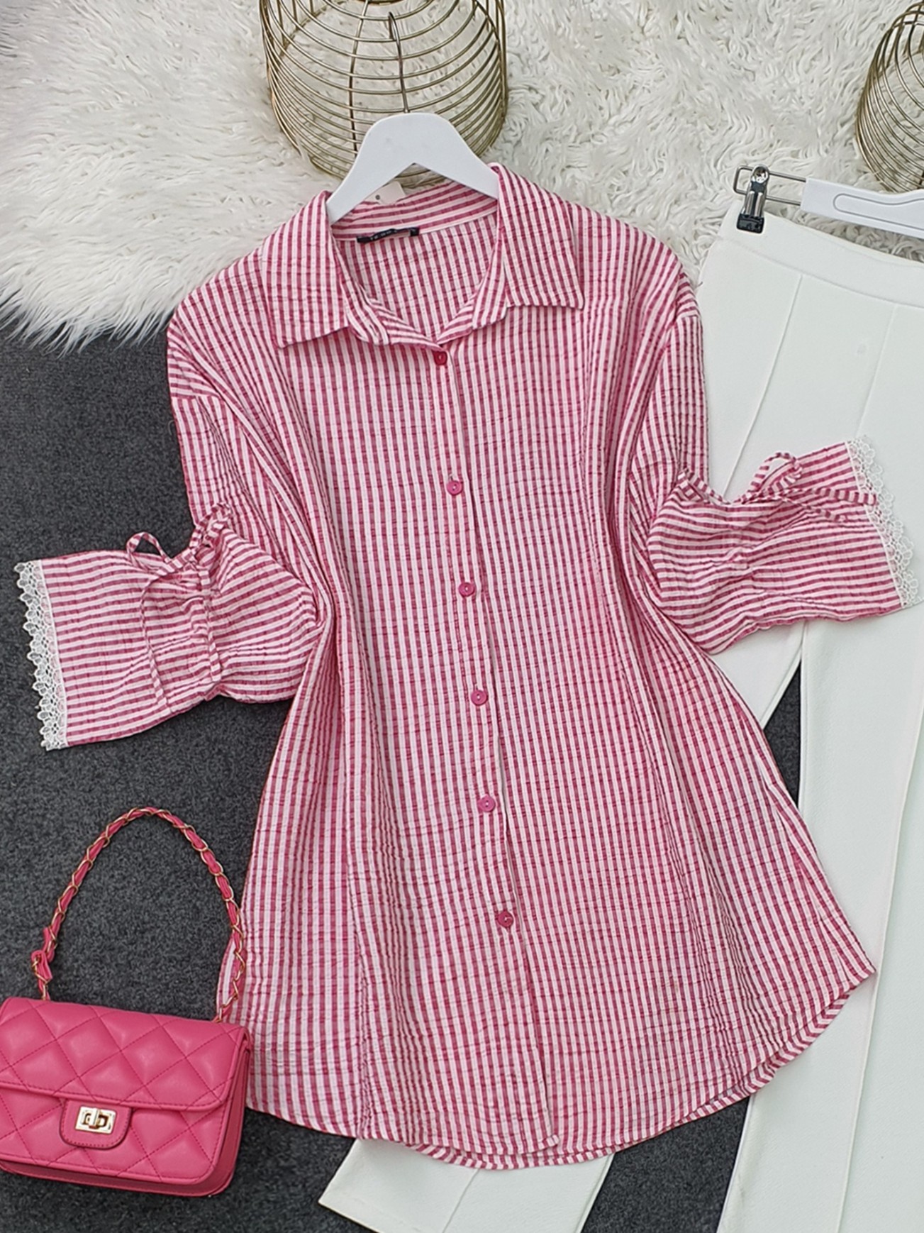 Kolu Dantelli Bağcıklı Çizgili Gömlek -Kırmızı-Kırmızı