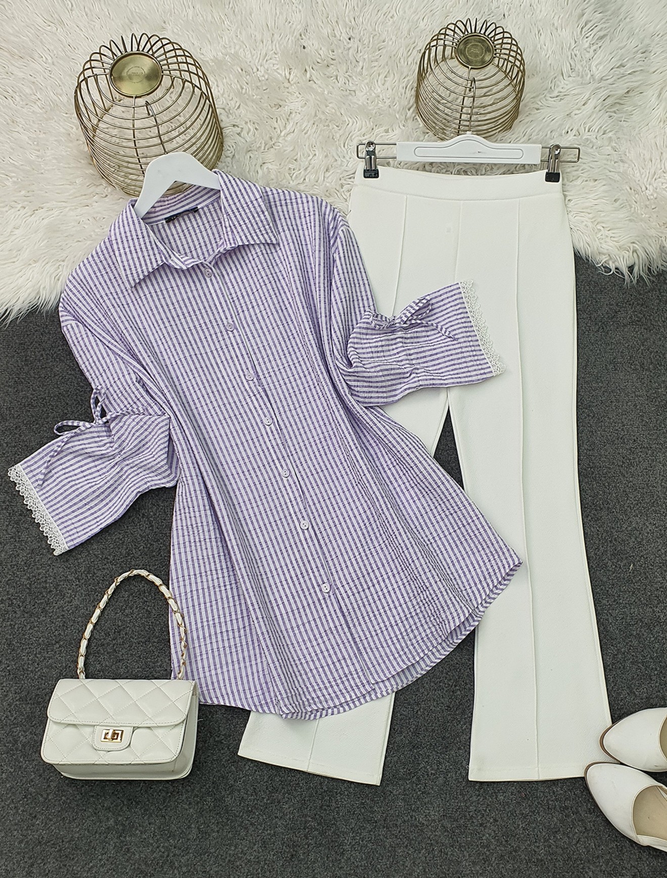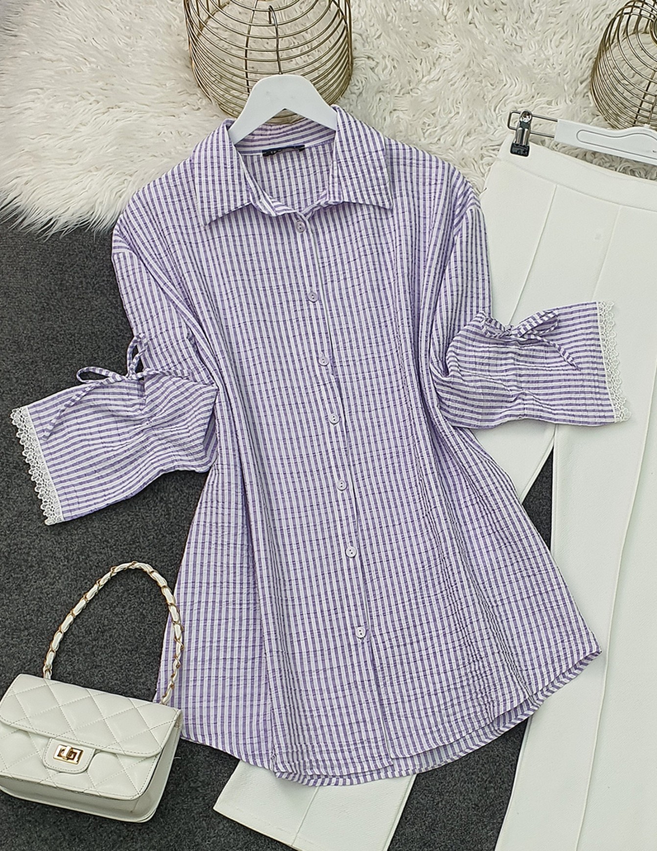 Kolu Dantelli Bağcıklı Çizgili Gömlek -Lila-Lila