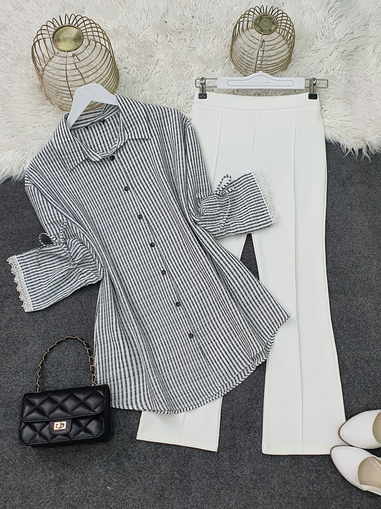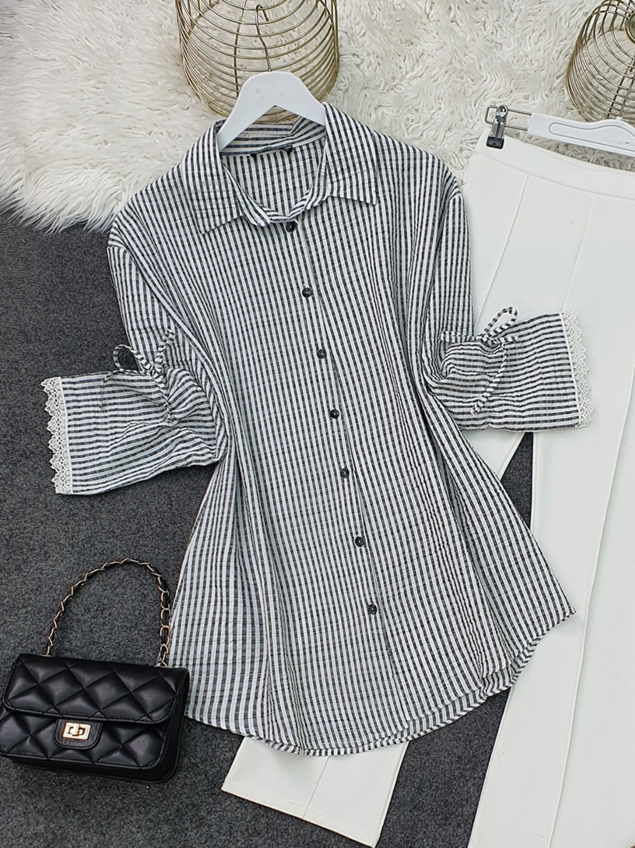 Kolu Dantelli Bağcıklı Çizgili Gömlek -Siyah-siyah