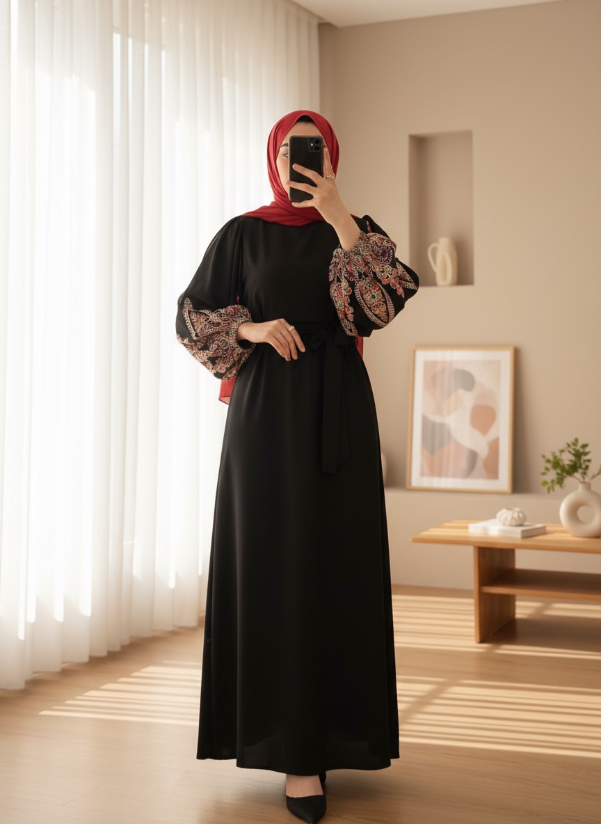 Kolu İşleme Tüllü Bağcıklı Kalem Elbise -Siyah-Siyah