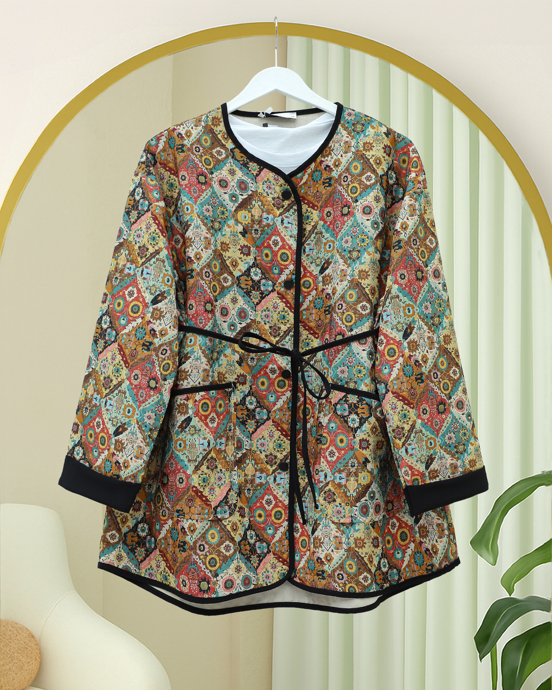 Kolu Katlamalı Beli Bağcıklı Etnik Desen Ceket -Çağla Y.-Çağla Y.
