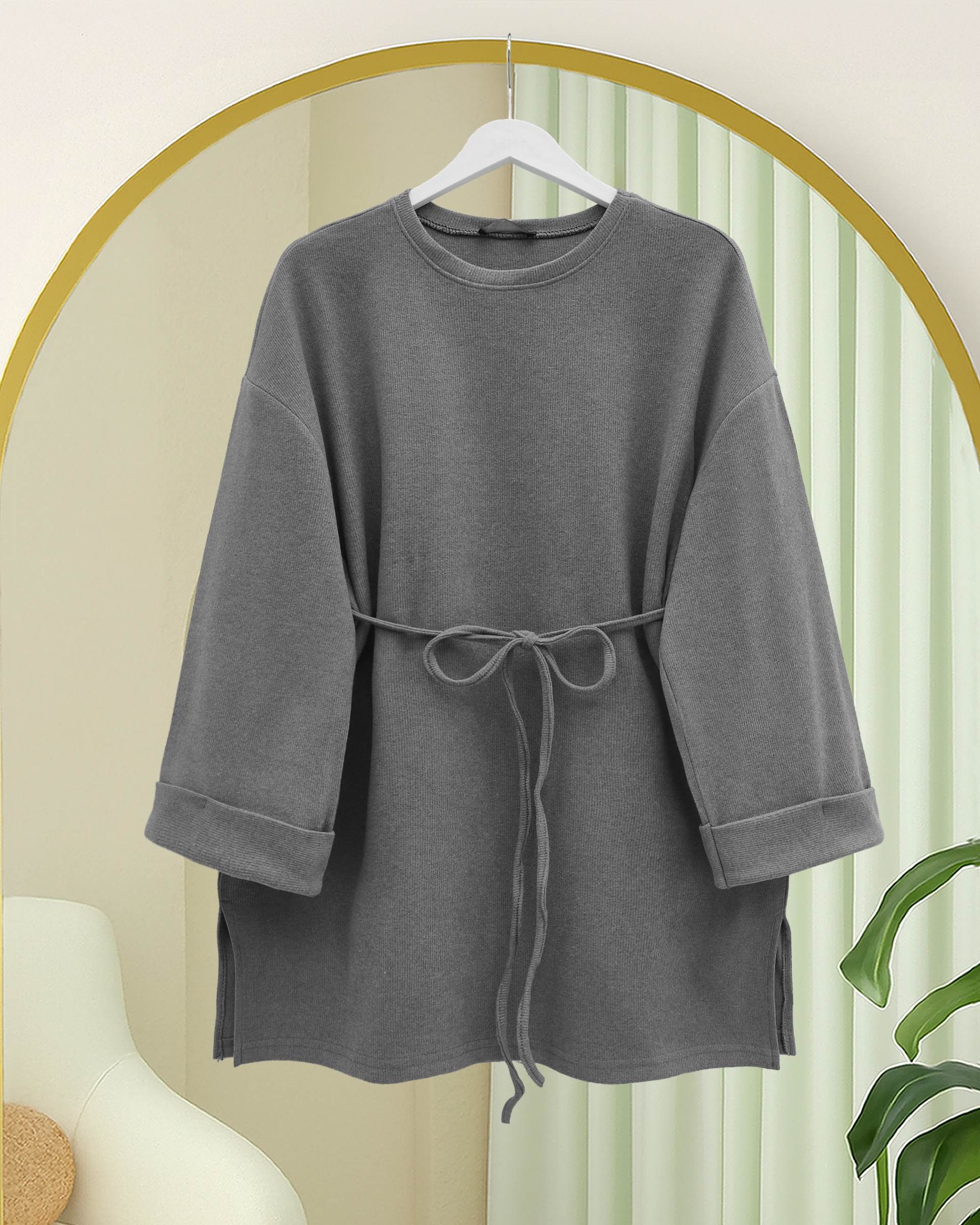 Kolu Katlı Beli Bağlamalı Yırtmaçlı Selanik Tunik -Gri-Gri