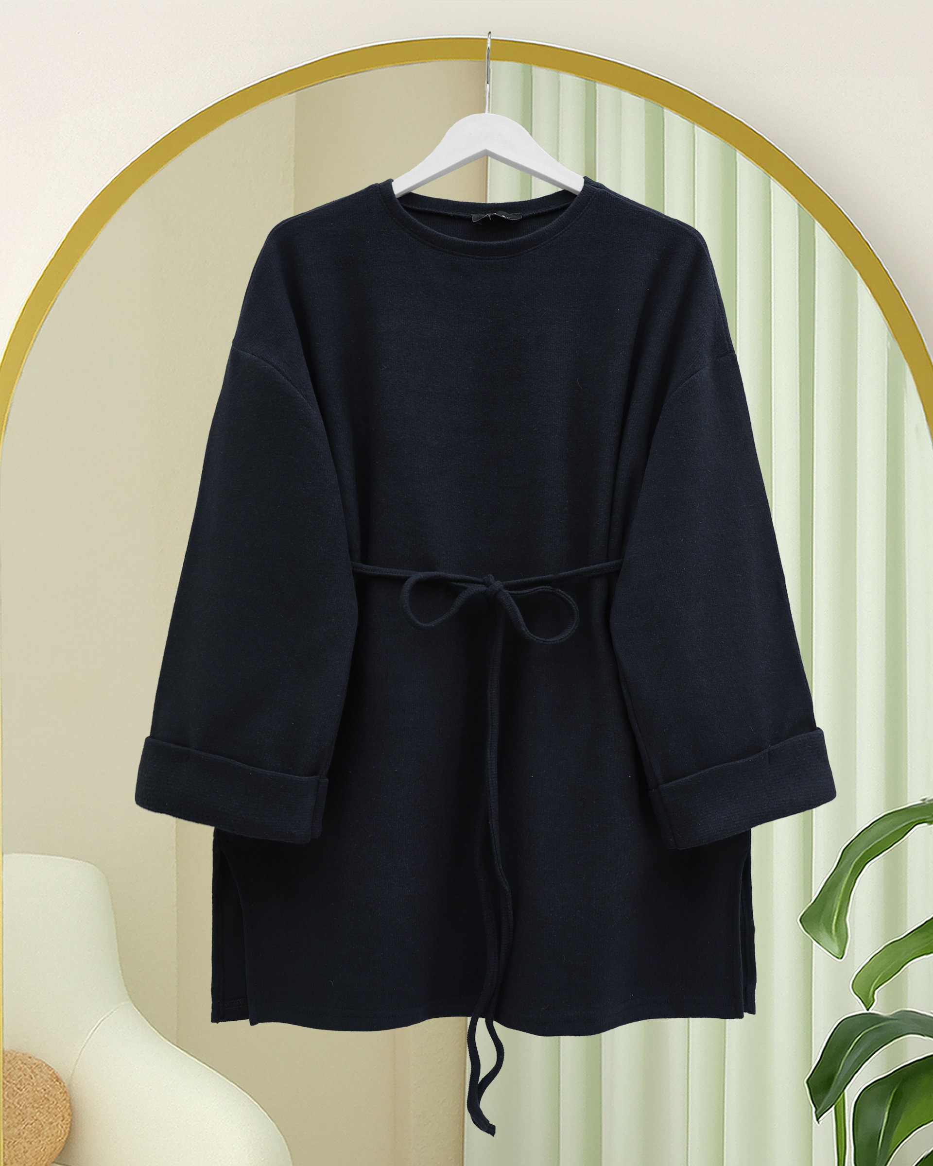 Kolu Katlı Beli Bağlamalı Yırtmaçlı Selanik Tunik -Laci-Lacivert