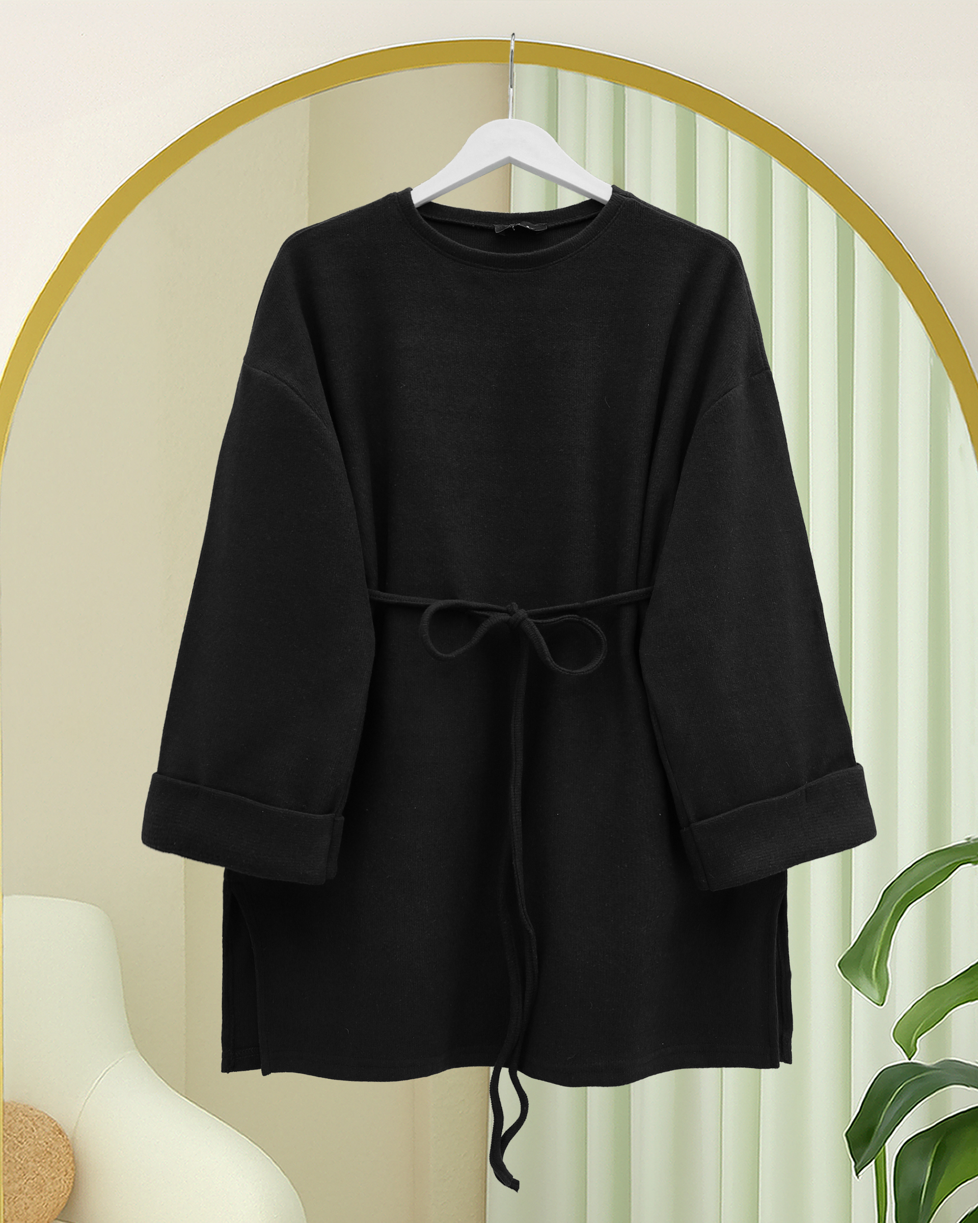 Kolu Katlı Beli Bağlamalı Yırtmaçlı Selanik Tunik -Siyah-siyah
