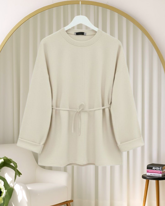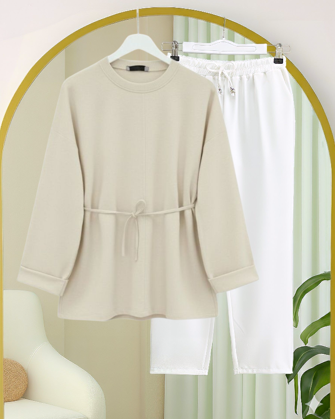 Kolu Katlı Beli Bağlamalı Yırtmaçlı Penye Tunik -Bej-Bej