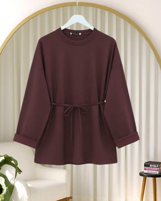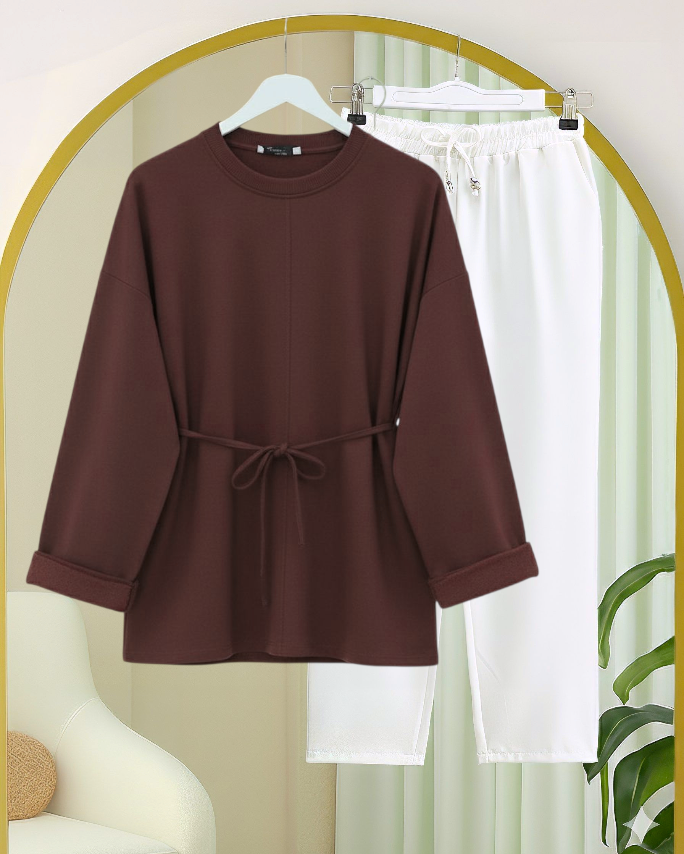 Kolu Katlı Beli Bağlamalı Yırtmaçlı Penye Tunik -K. Kahve-K. Kahve
