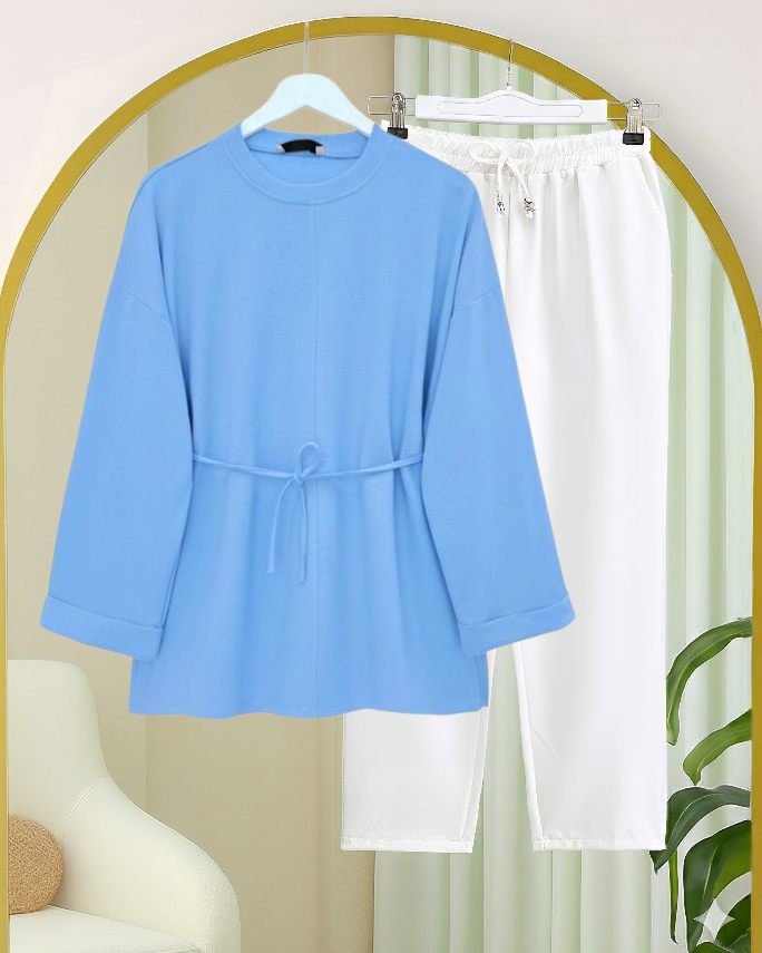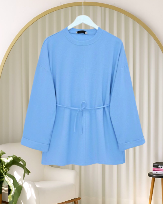 Kolu Katlı Beli Bağlamalı Yırtmaçlı Penye Tunik -Mavi-Mavi