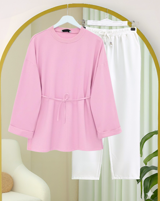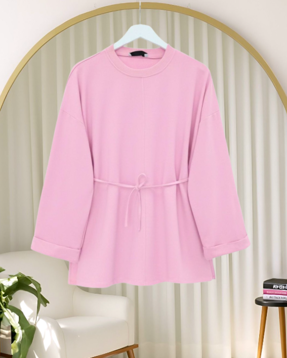 Kolu Katlı Beli Bağlamalı Yırtmaçlı Penye Tunik -Pembe-Pembe