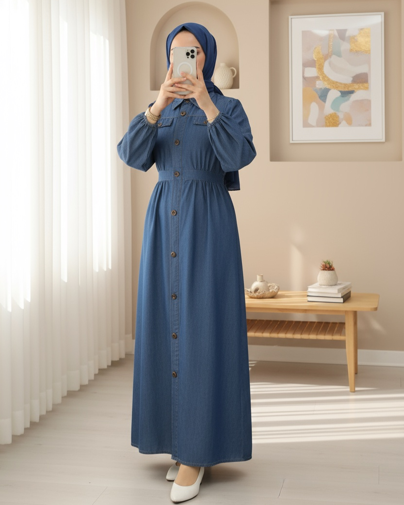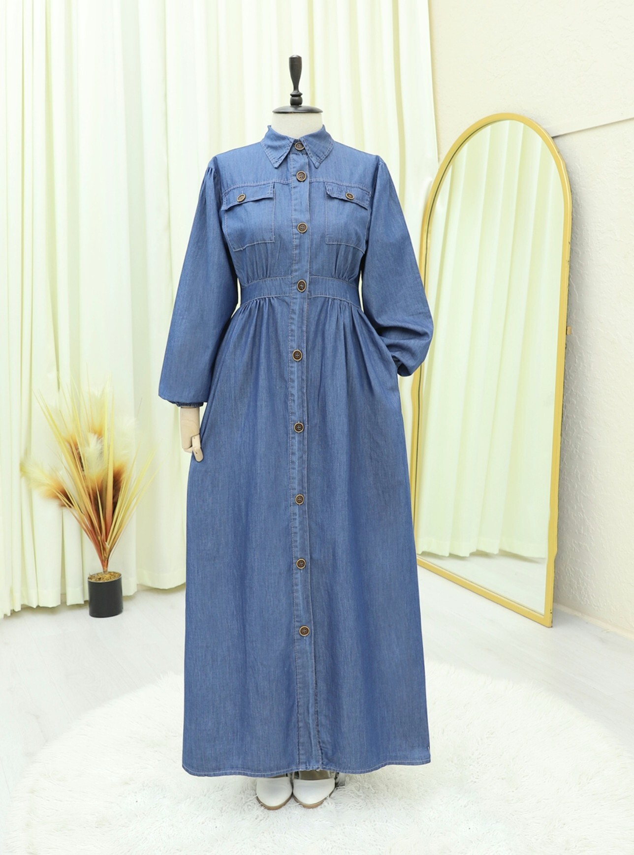 Kolu Lastikli Boydan Düğmeli Çift Cepli Kot Elbise -Mavi-Mavi