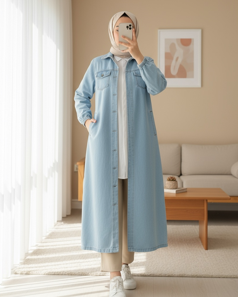Kolu Lastikli Boydan Düğmeli Kot Kap -Açık Mavi-Açık Mavi