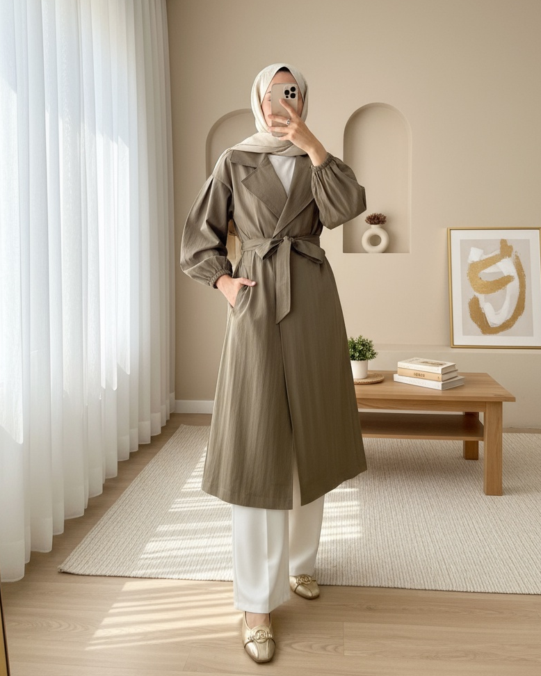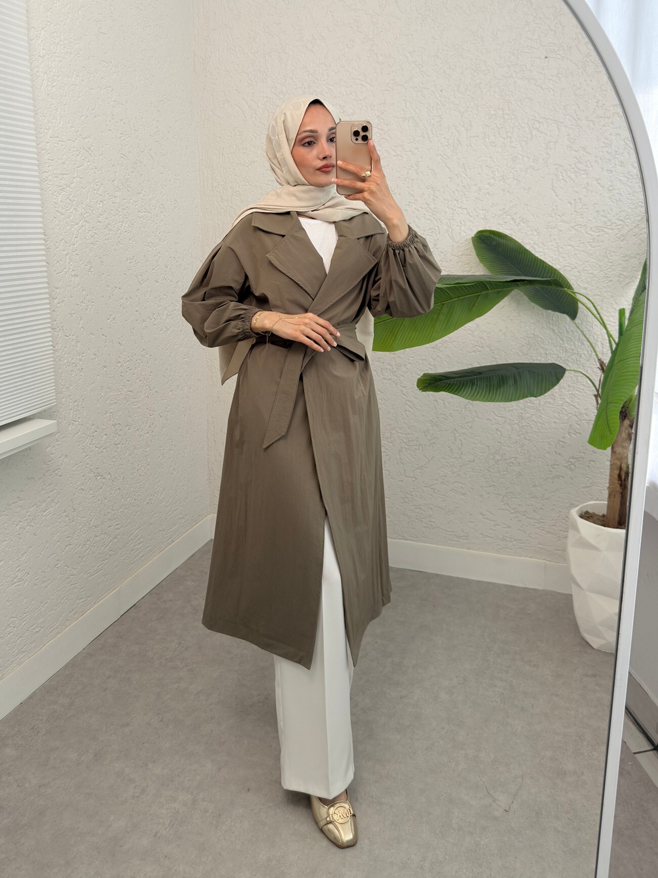 Kolu Lastikli Kemerli Astarlı Trençkot -Haki-Haki