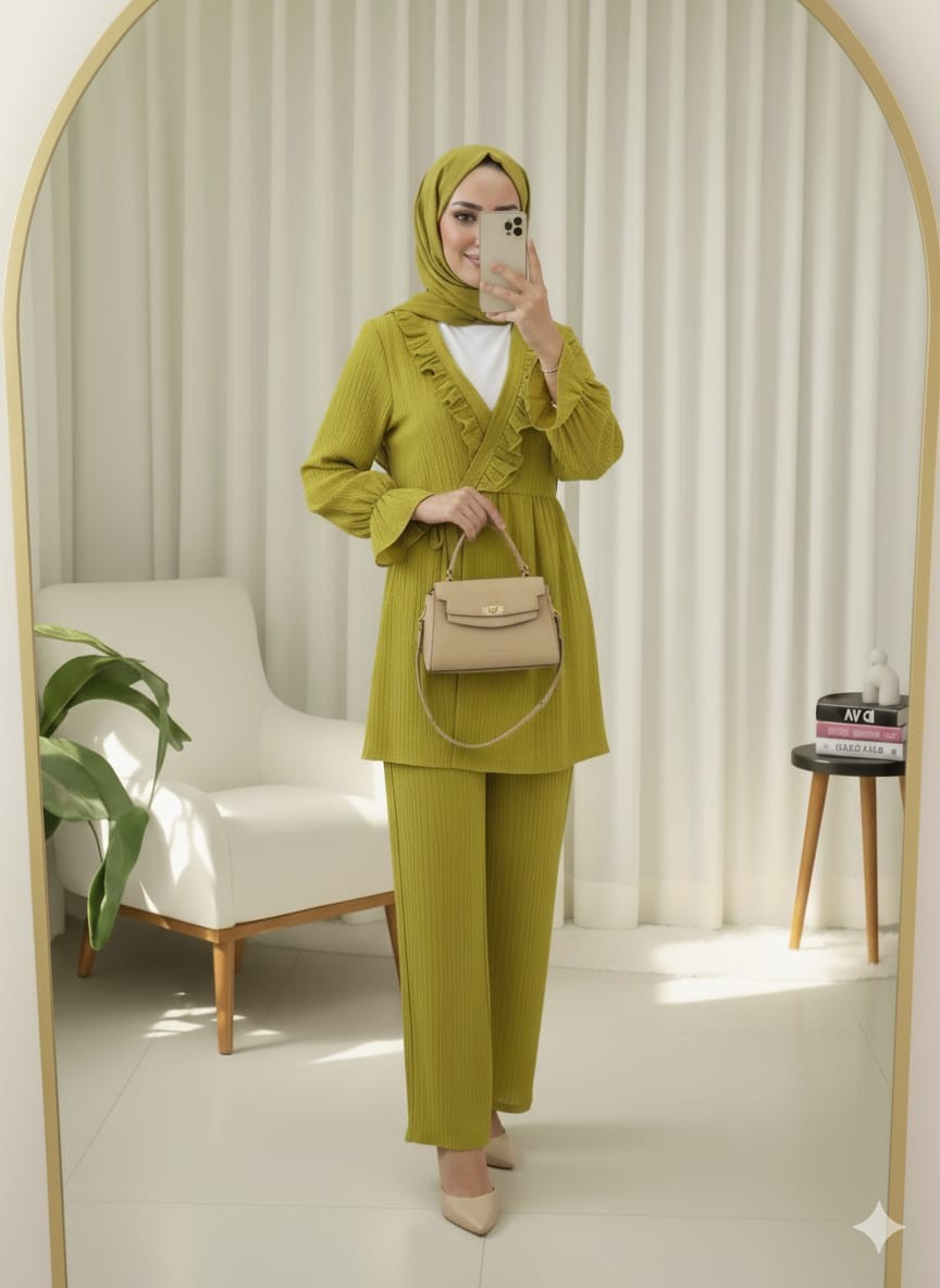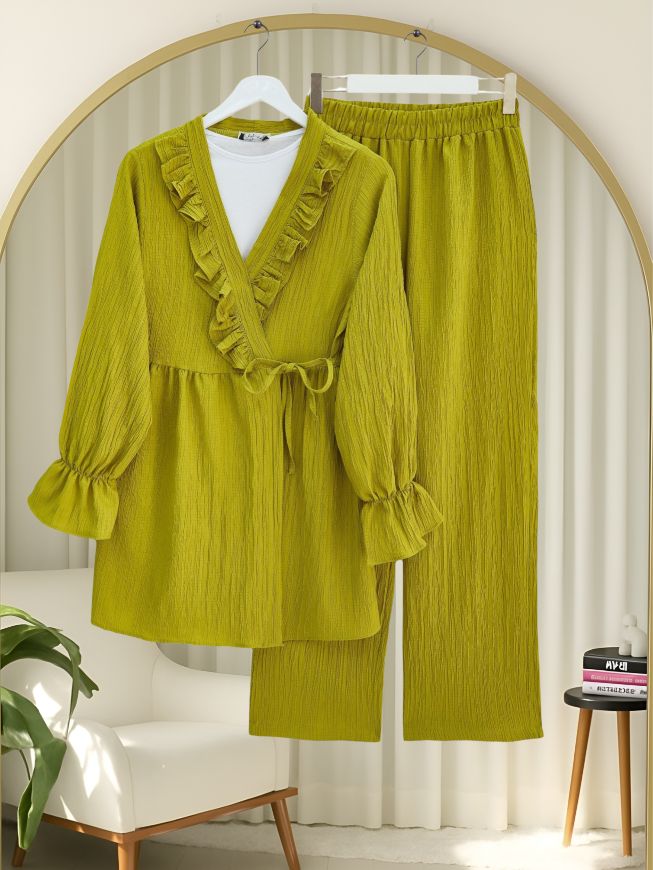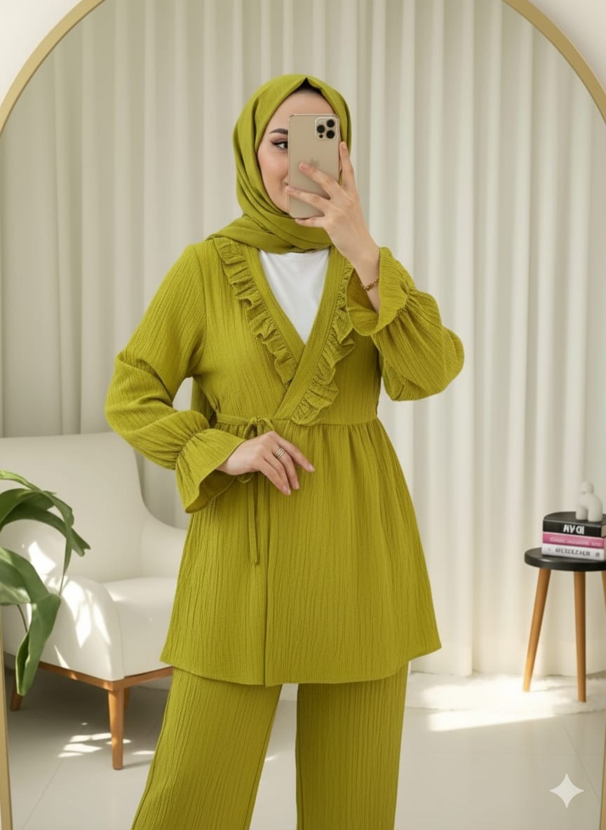 Kolu Lastikli Önü Fırfırlı Bağcıklı Krinkıl Kimono Takım -Yağ Yeşili-Yağ Yeşili