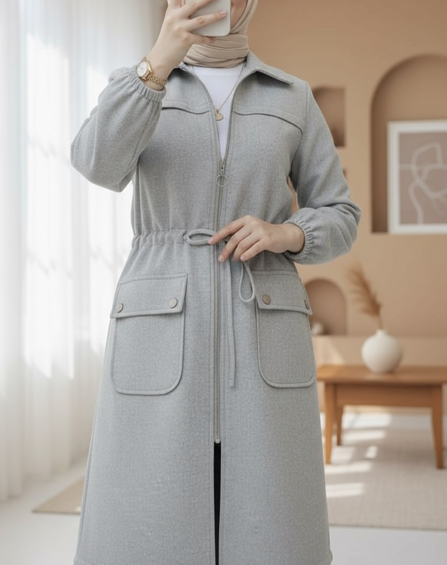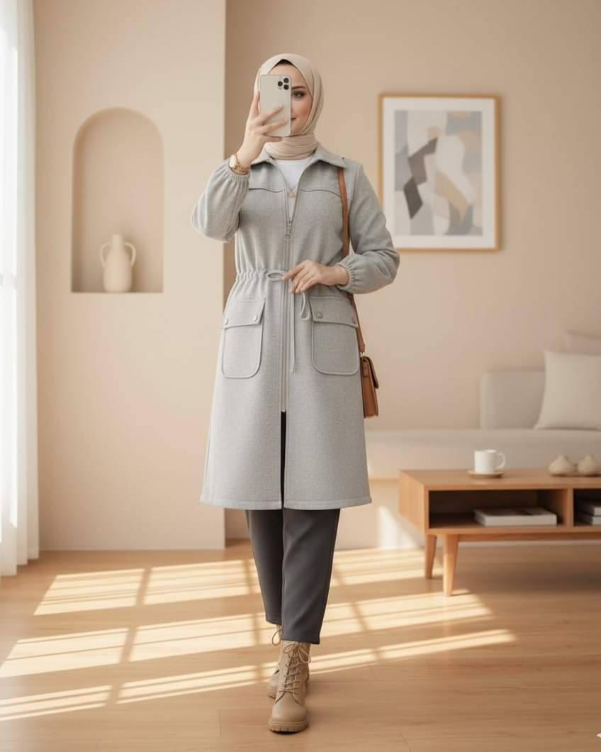 Kolu Lastikli Top Düğme Cepli Fermuarlı Kaşe Kap -Füme-Füme