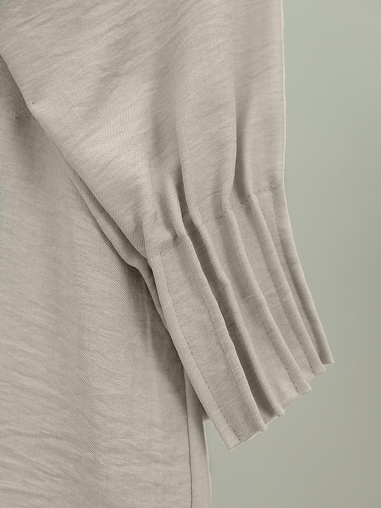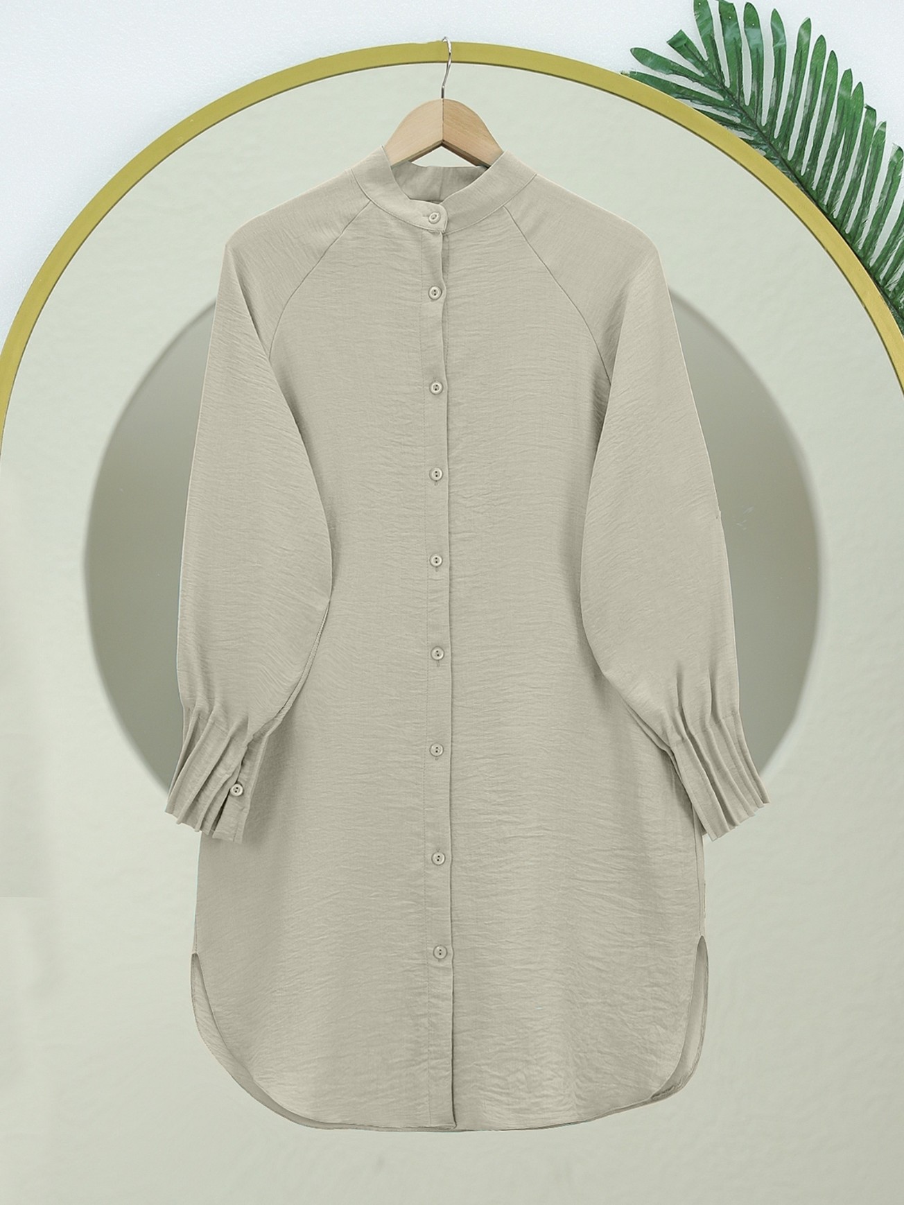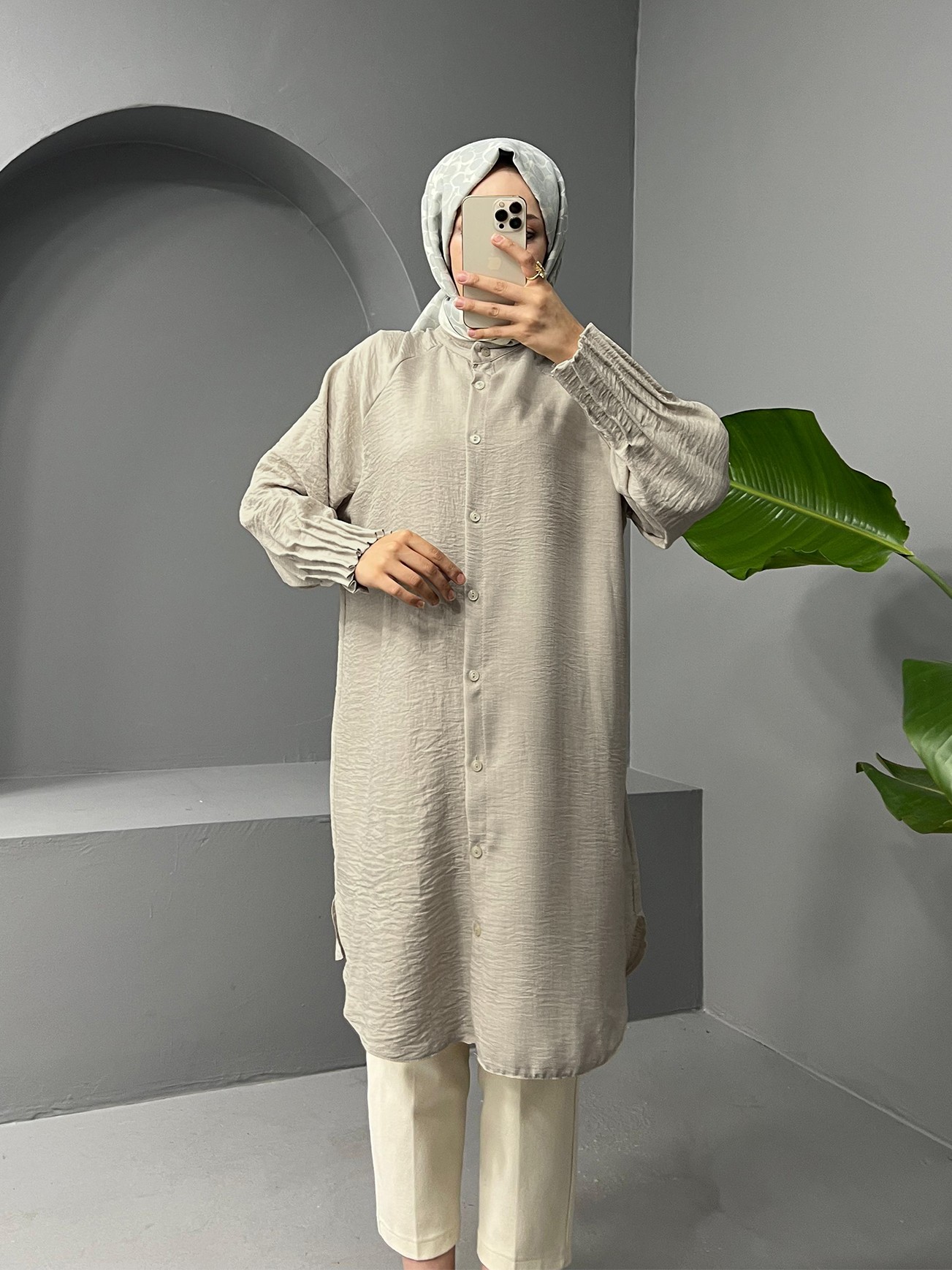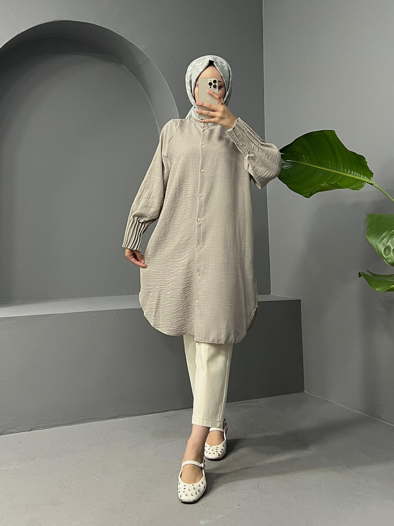 Kolu Nervürlü Eteği Oval Kesim Uzun Tunik -Bej-Bej