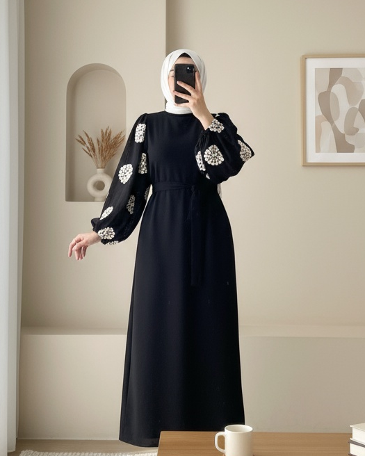 Kolu Tül Nakışlı Kalem Elbise -Siyah-Siyah