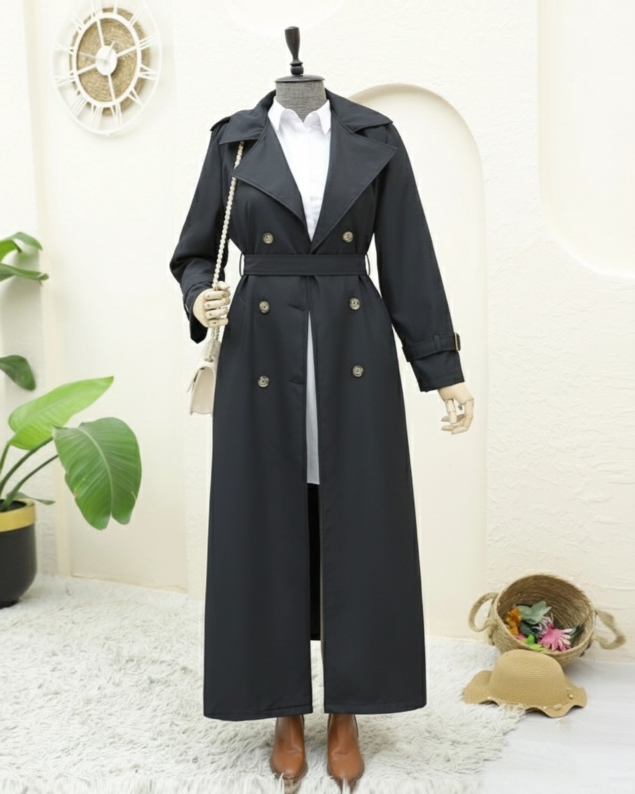Kolu Ve Omuzu Apoletli Cepli Uzun Trençkot -Siyah-siyah