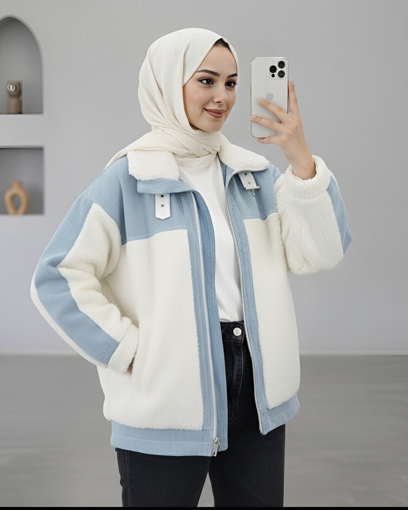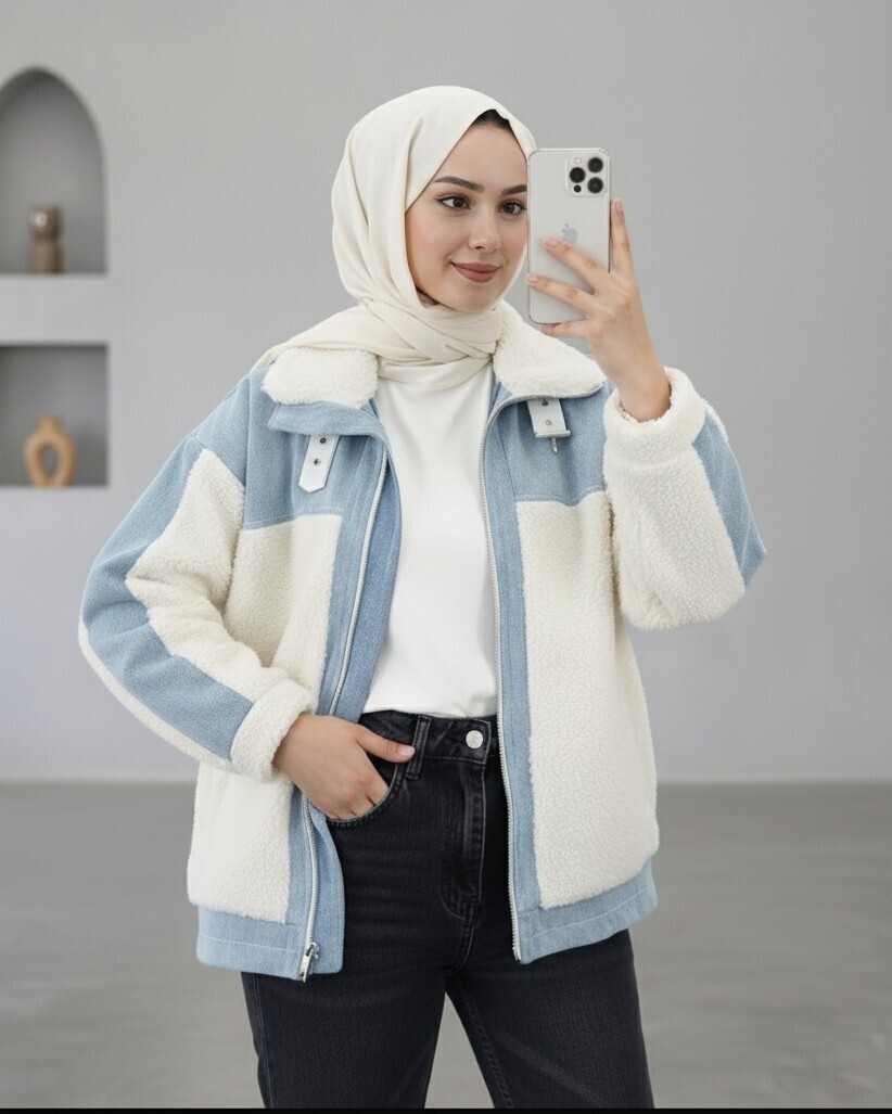 Kot Detaylı Astarlı Cepli Peluş Mont -Beyaz-Beyaz