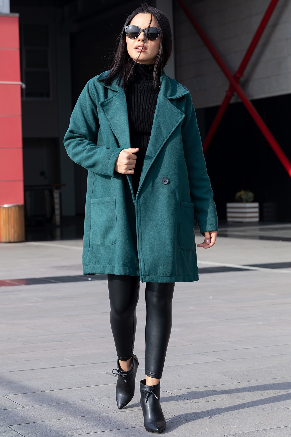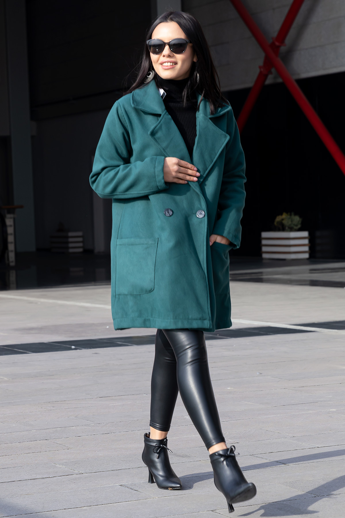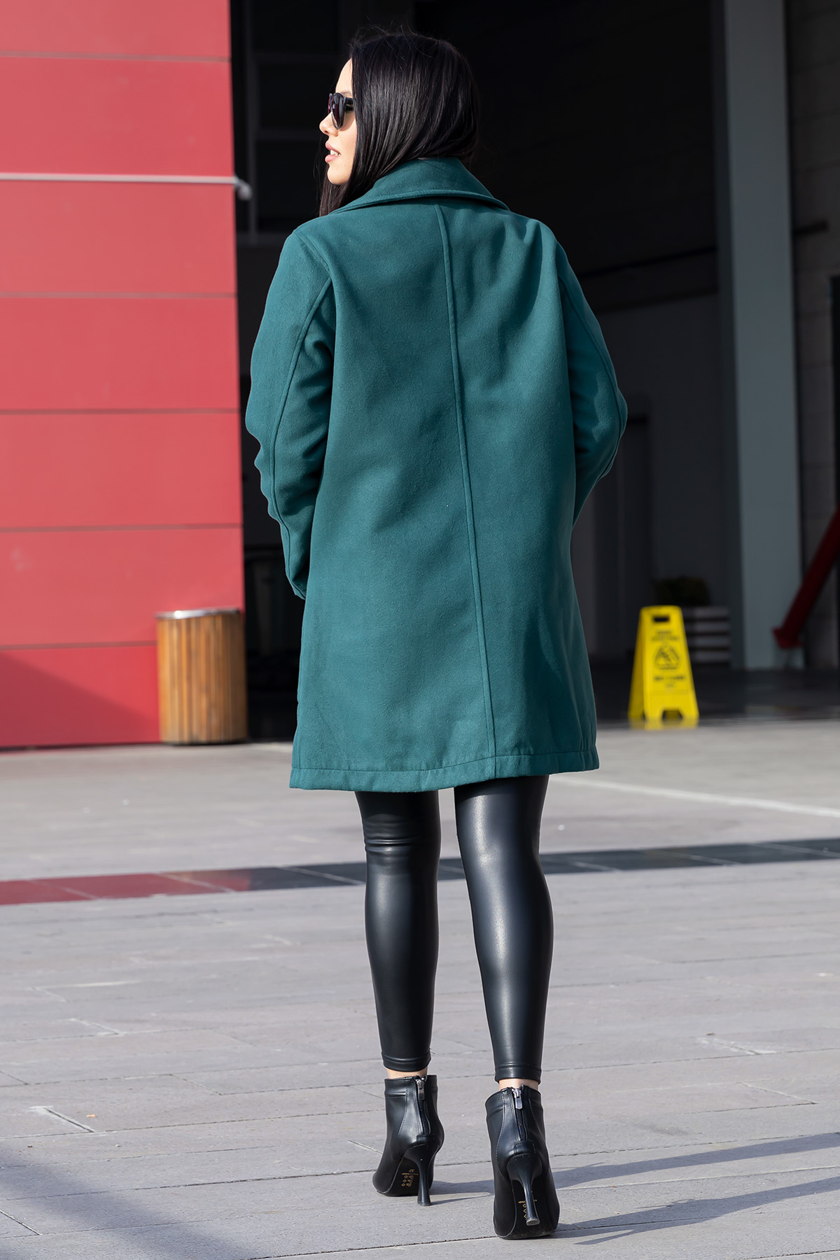 Kruvaze Düğmeli Kaşe Kaban-Koyu Yeşil