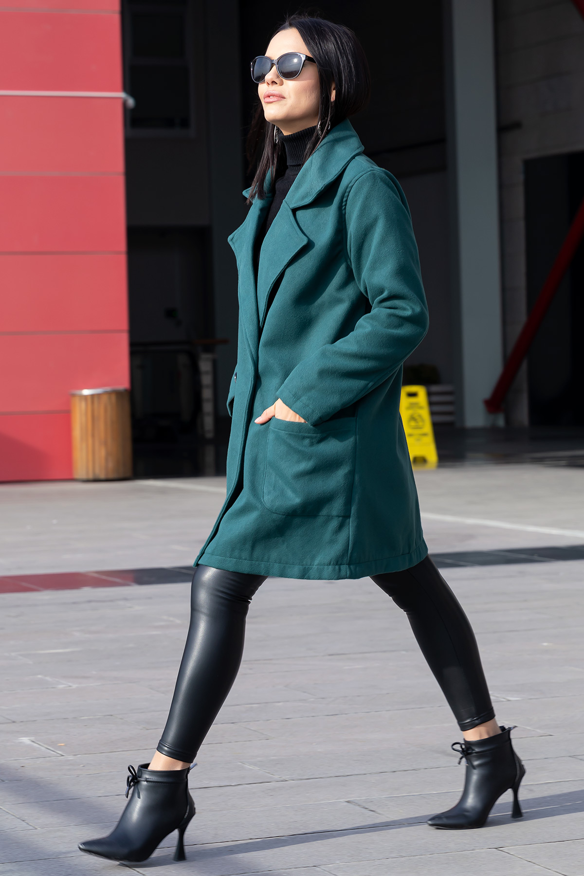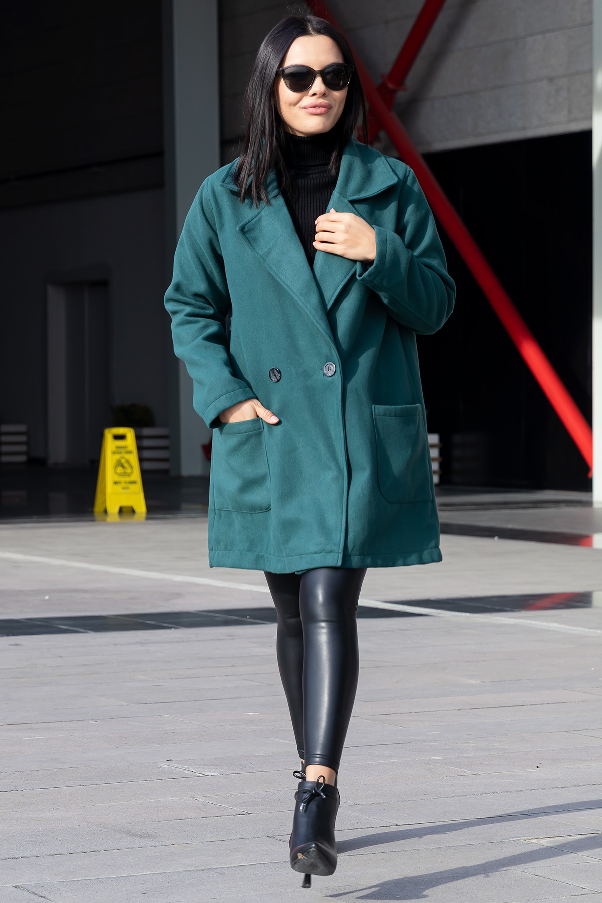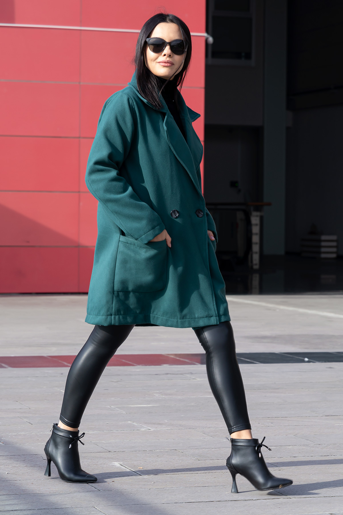 Kruvaze Düğmeli Kaşe Kaban-Koyu Yeşil