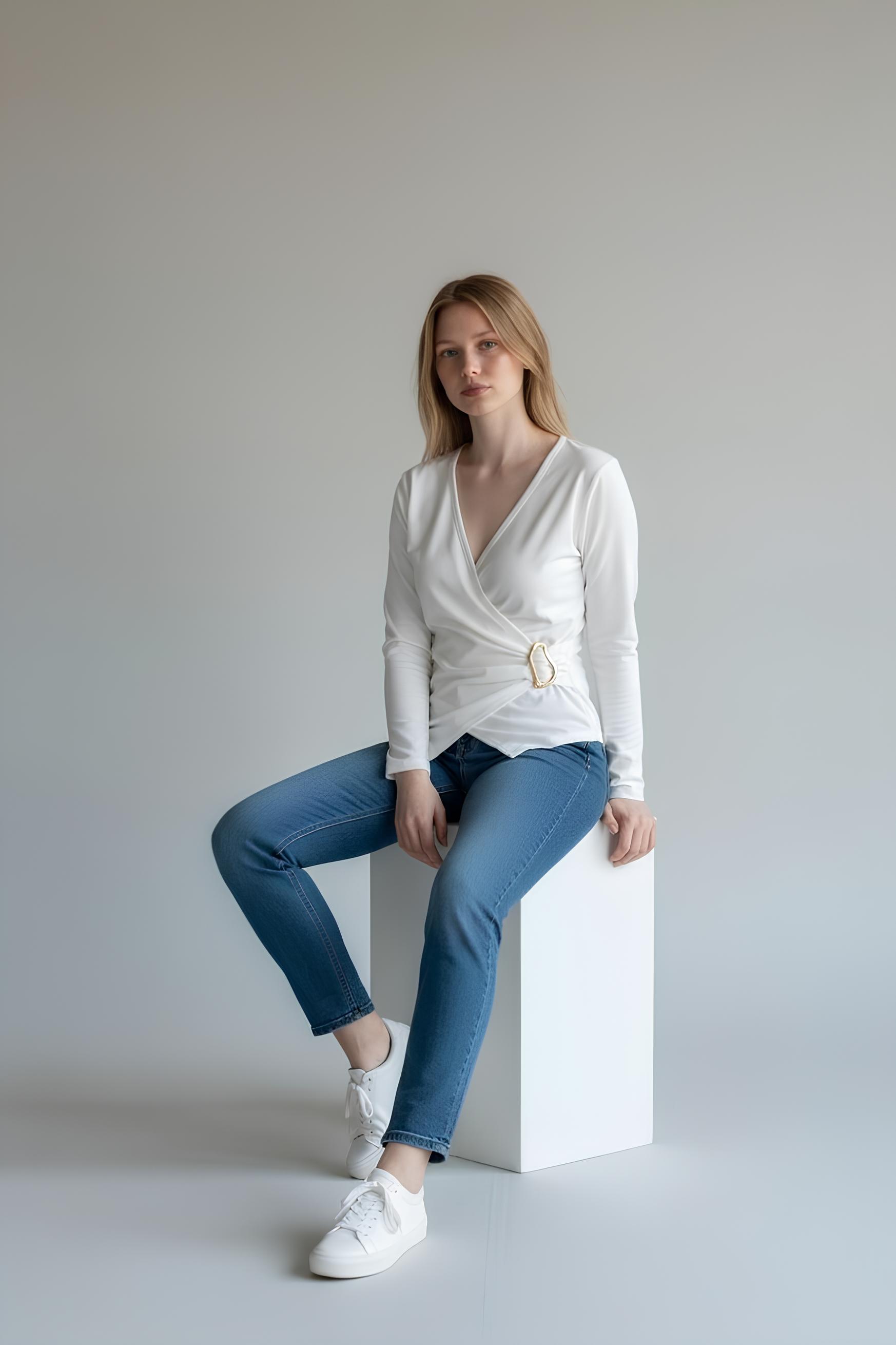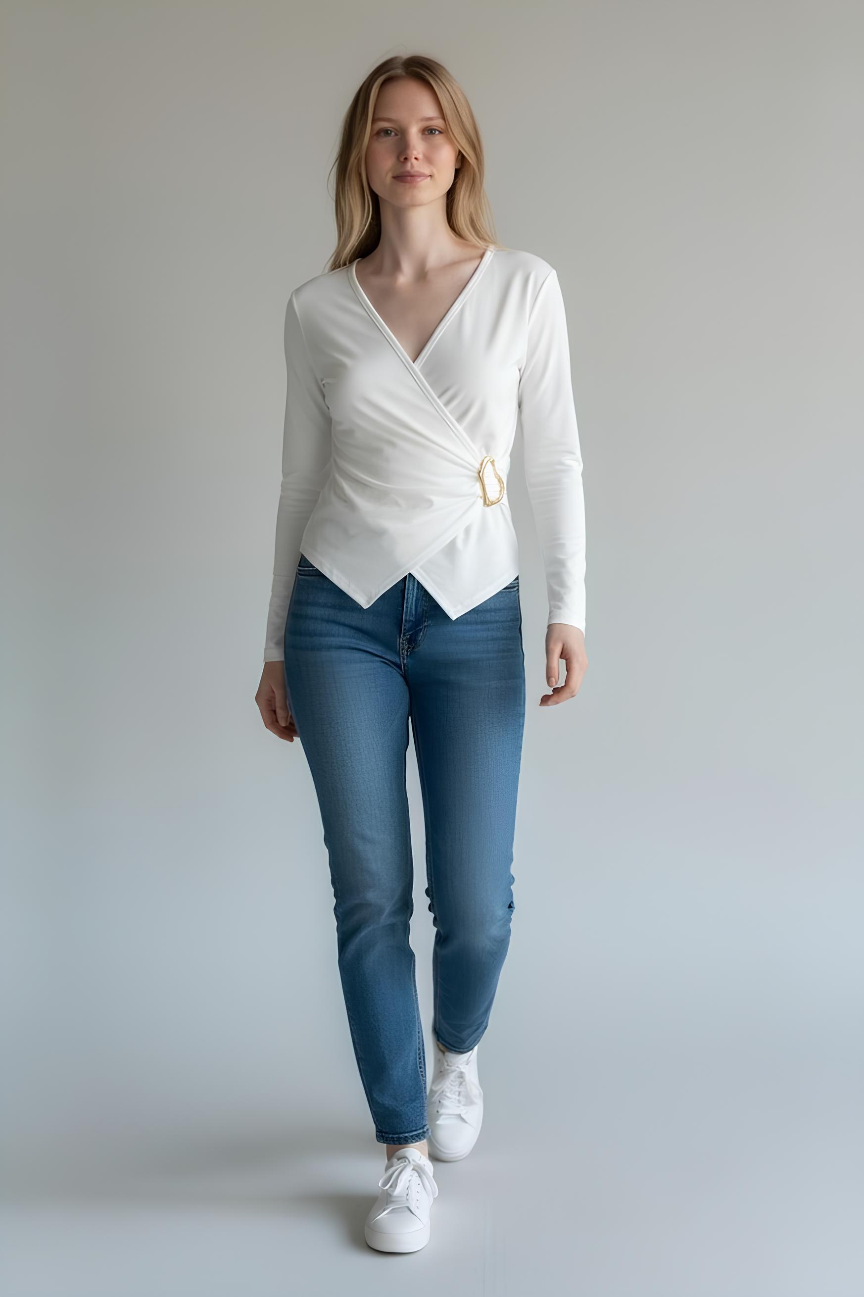 Kruvaze Tokalı Ribana Bluz Ekru - 5161-Ekru