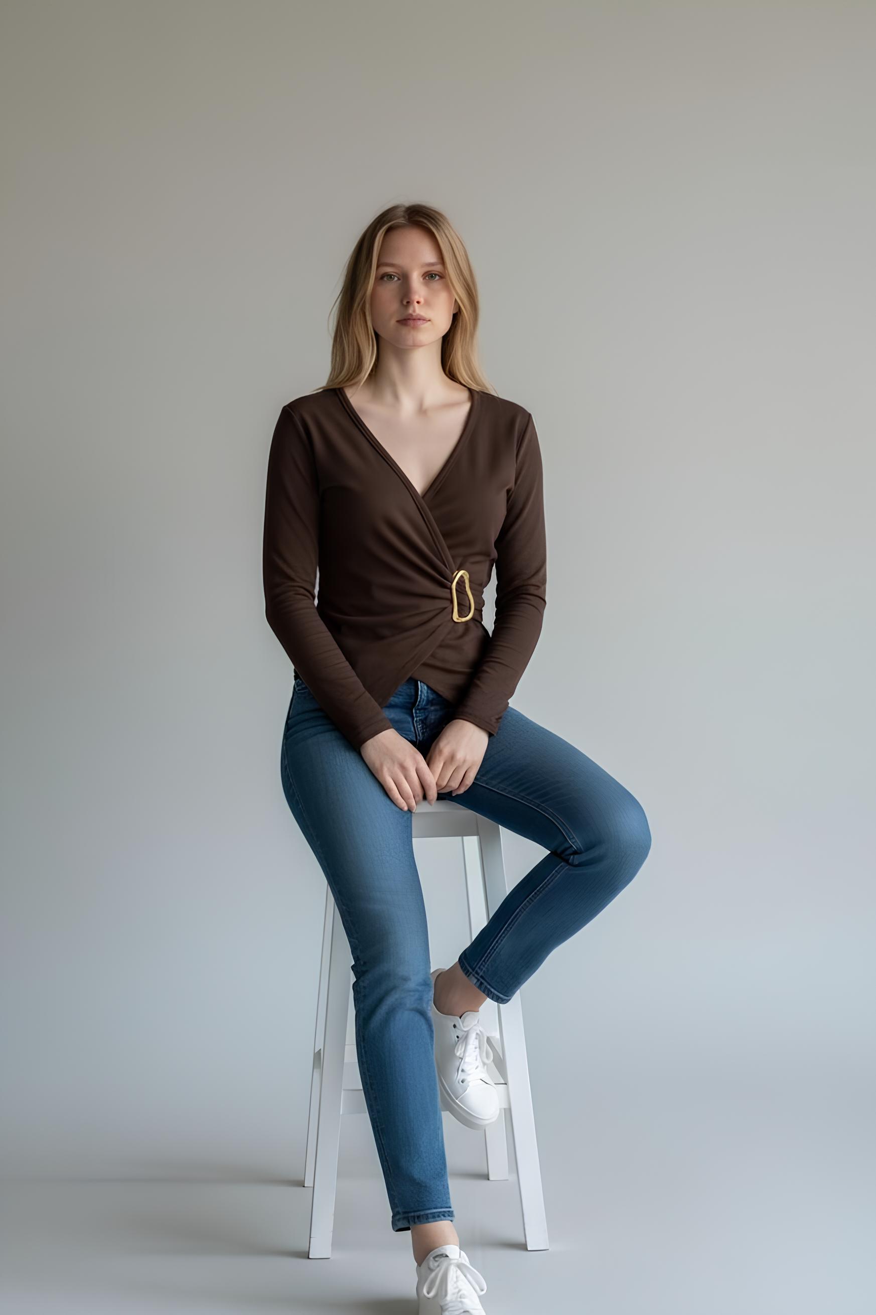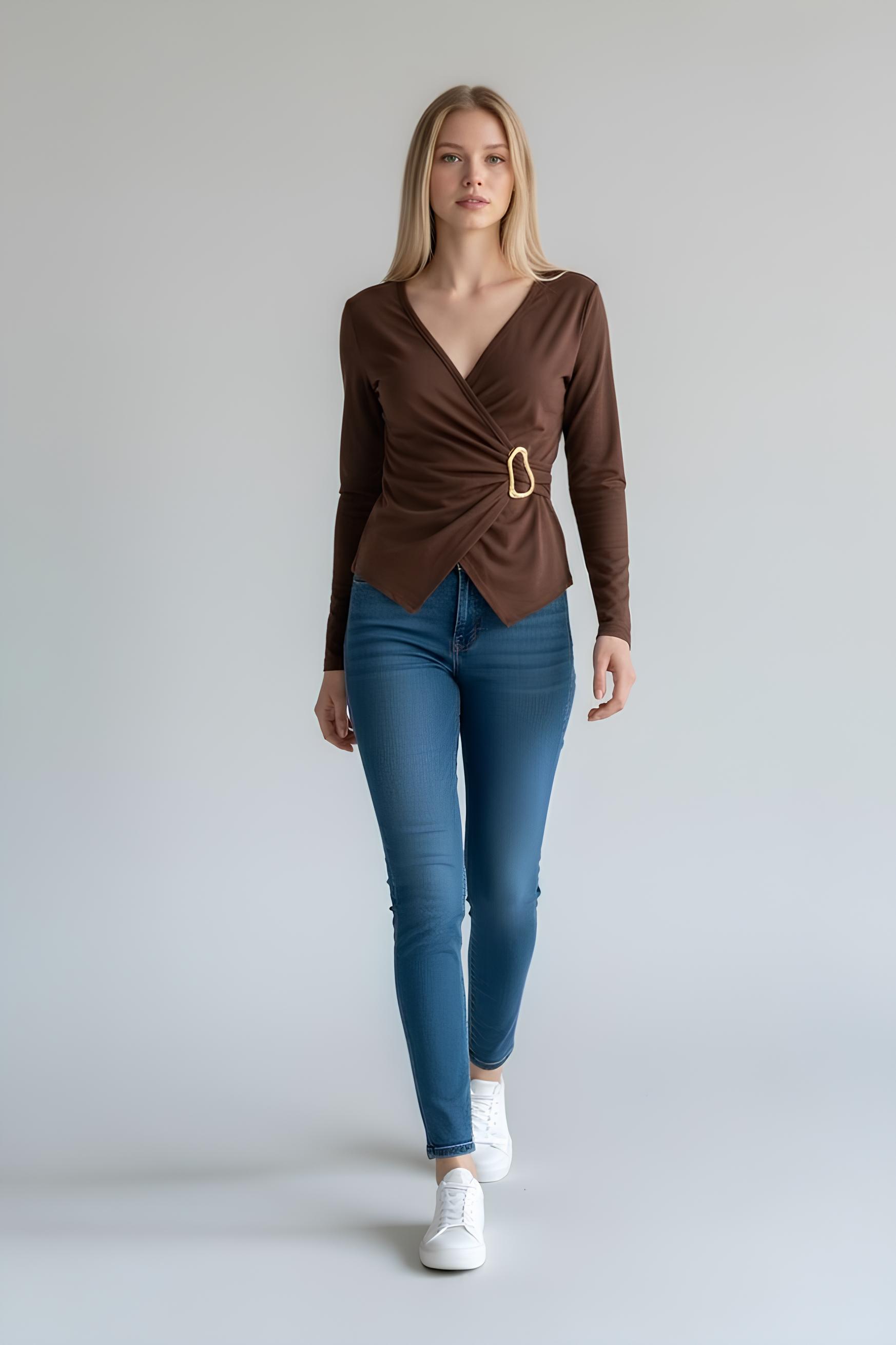 Kruvaze Tokalı Ribana Bluz Kahve - 5161-Kahve