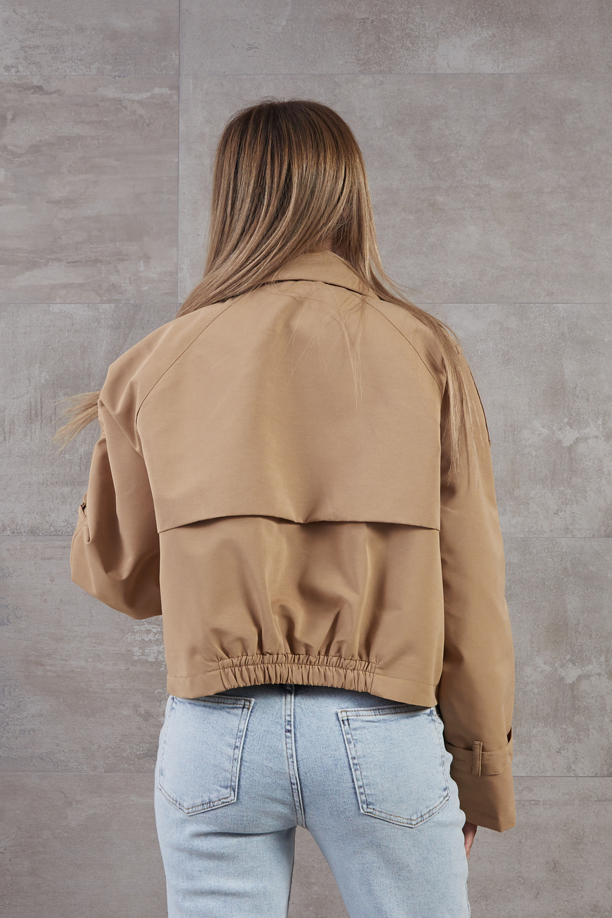 Kruvaze Yaka Düğmeli Kısa Ceket-Sütlü Kahve
