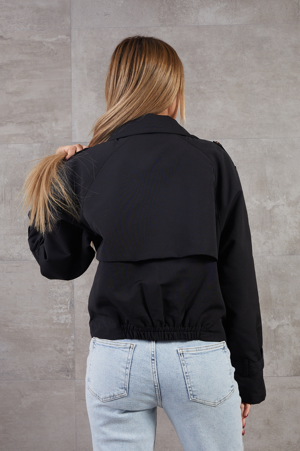 Kruvaze Yaka Düğmeli Kısa Ceket-Siyah