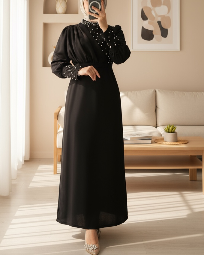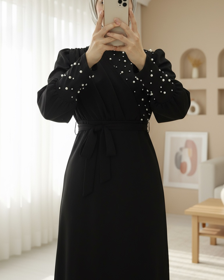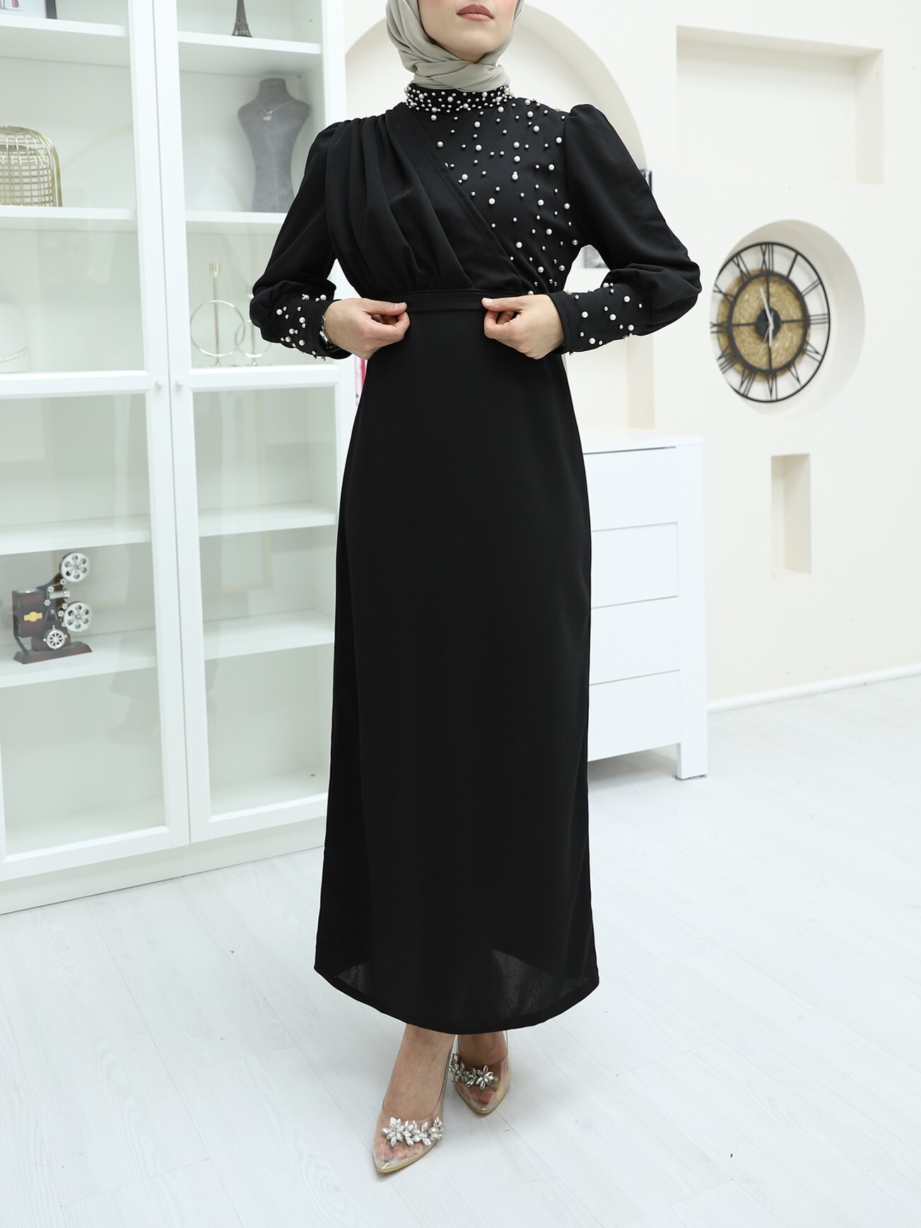 Kruvaze Yaka İnci Detaylı Krep Elbise -Siyah-Siyah
