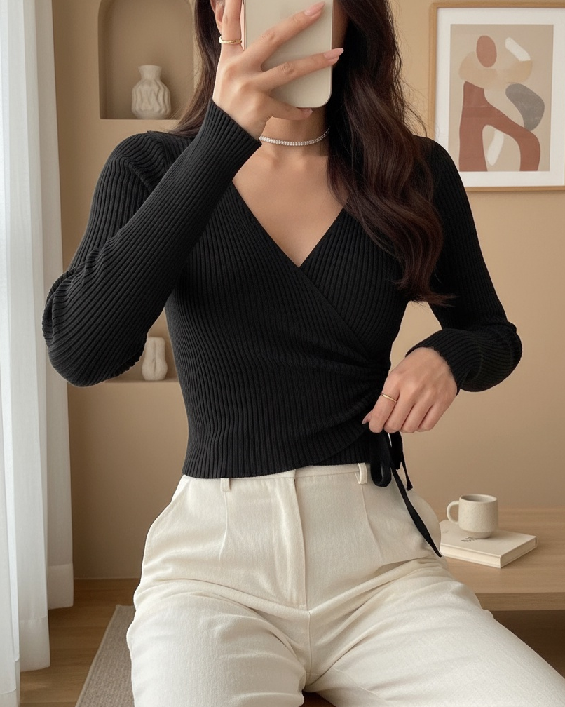 Kruvaze Yaka Önü Çift Kat Triko Crop -Siyah-Siyah