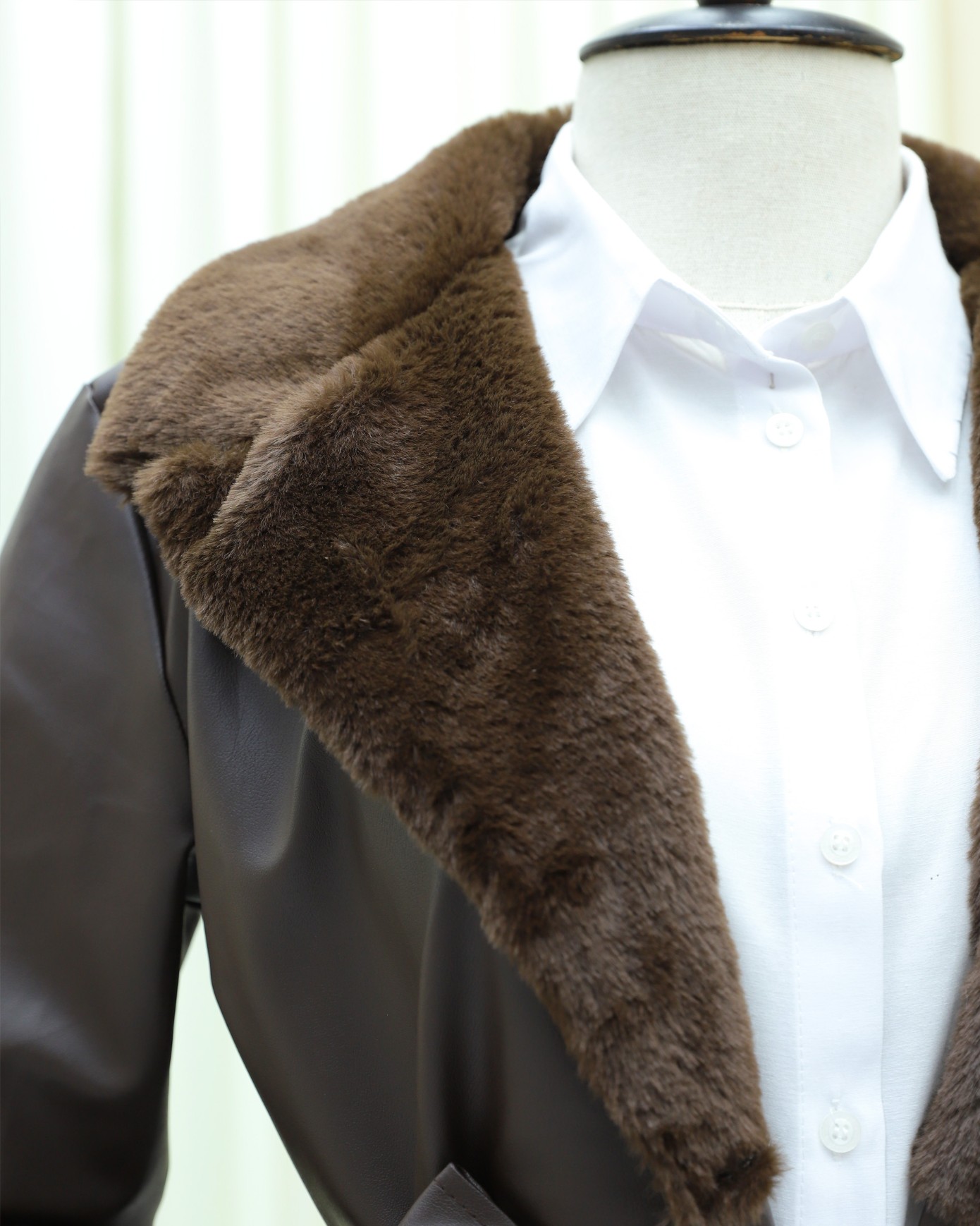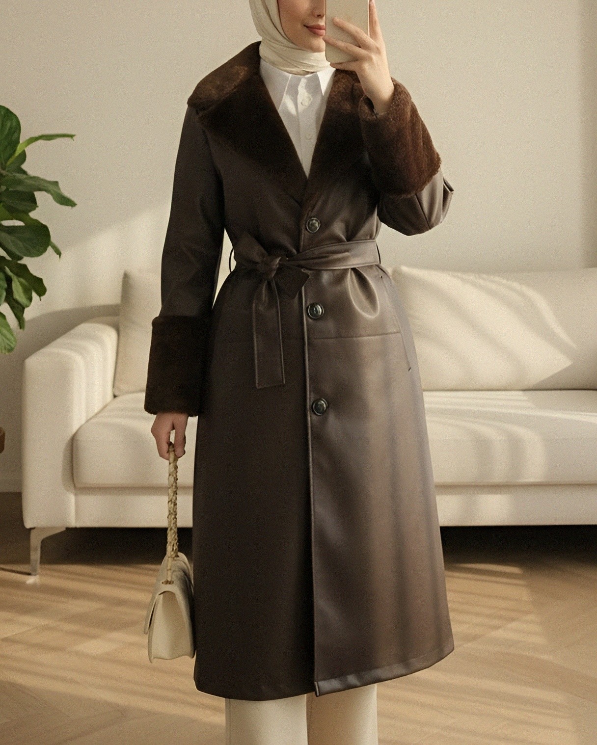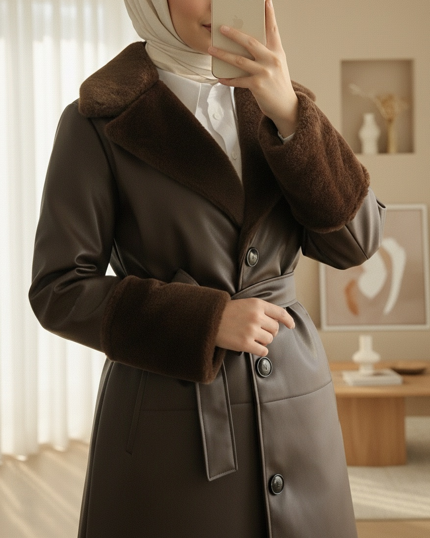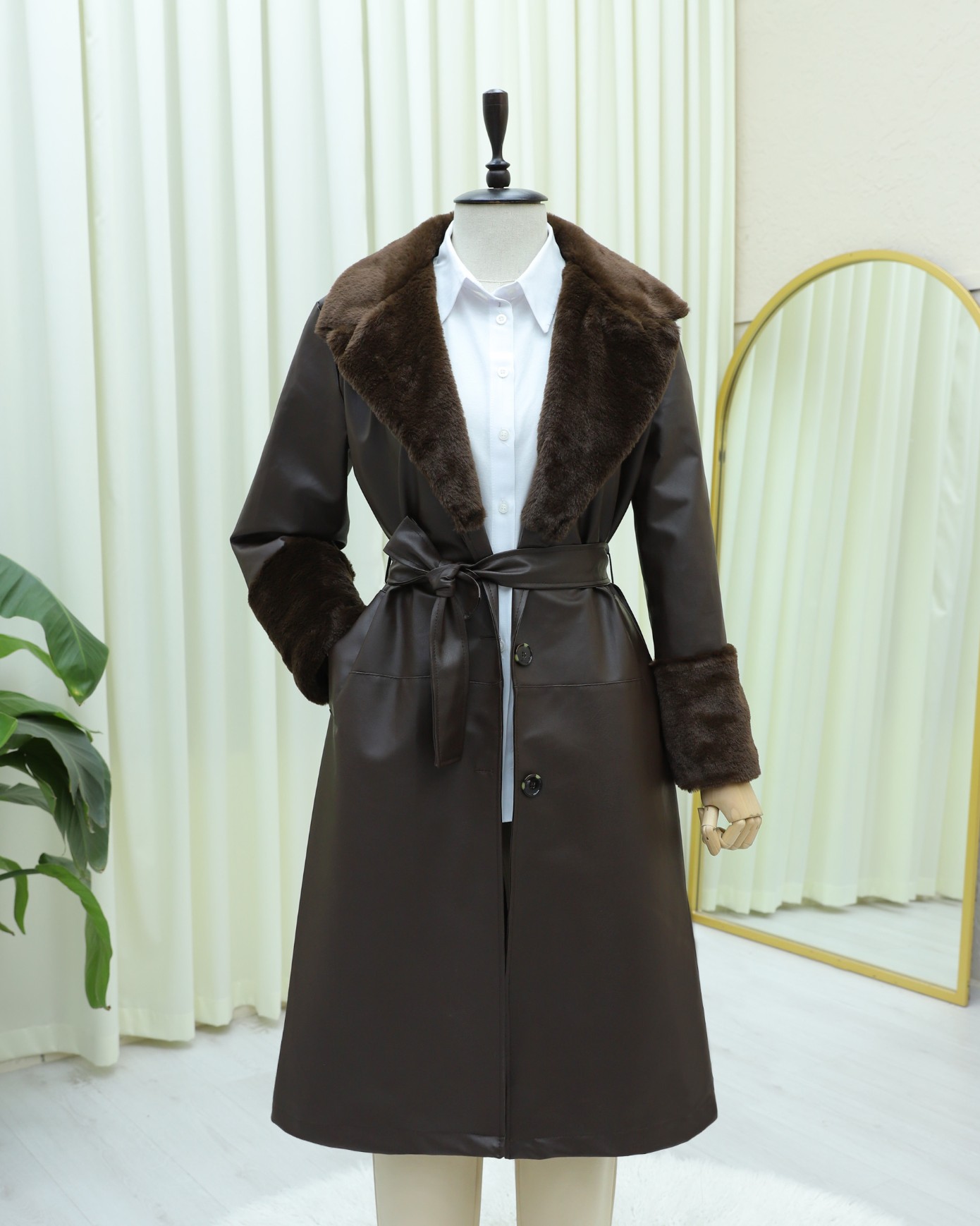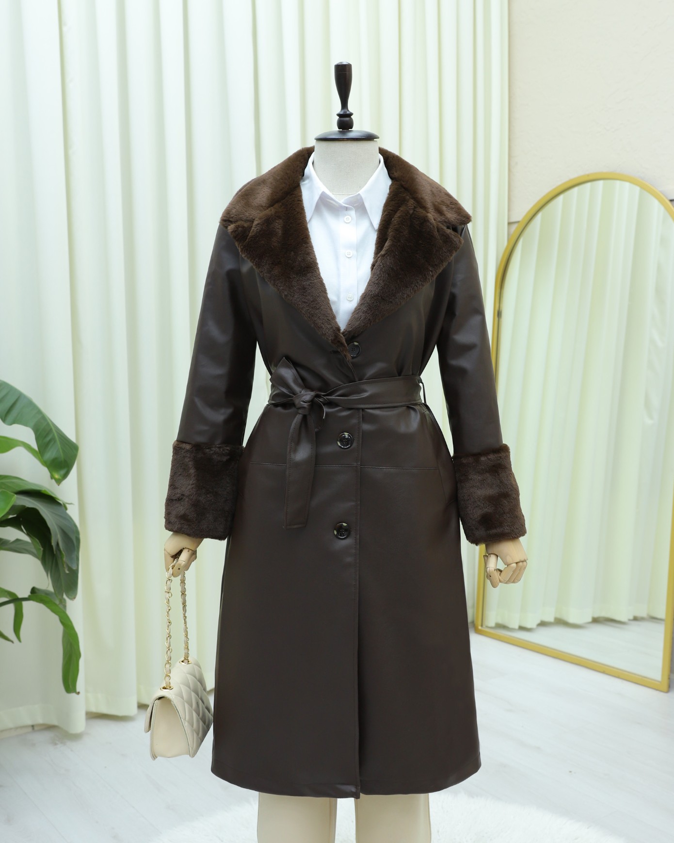 Kürklü Önü Düğmeli Kemerli Deri Pardesü -K. Kahve-K. Kahve