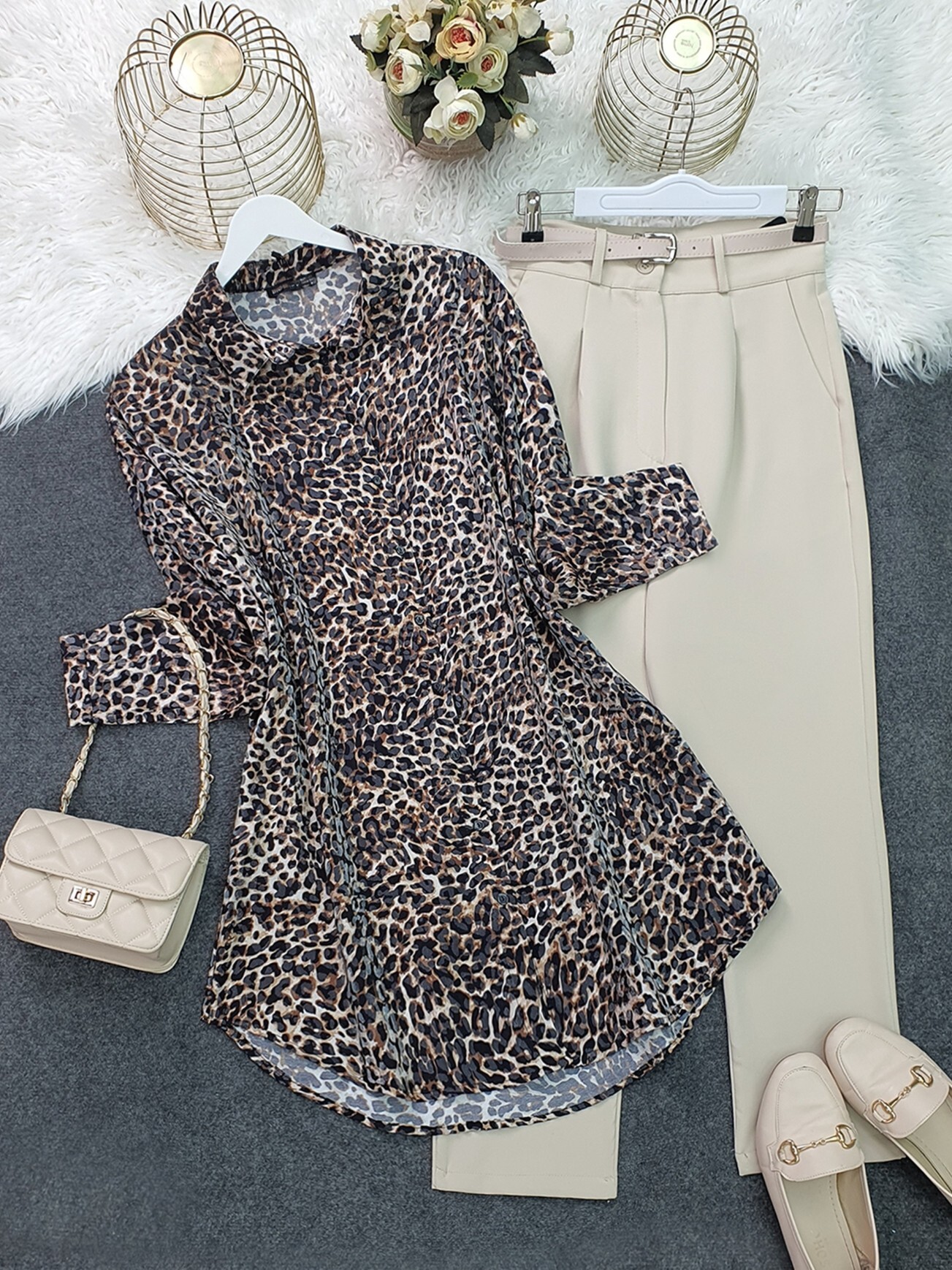 Leopar Desen Düğmeli Oval Kesim Gömlek -Leopar-Leopar