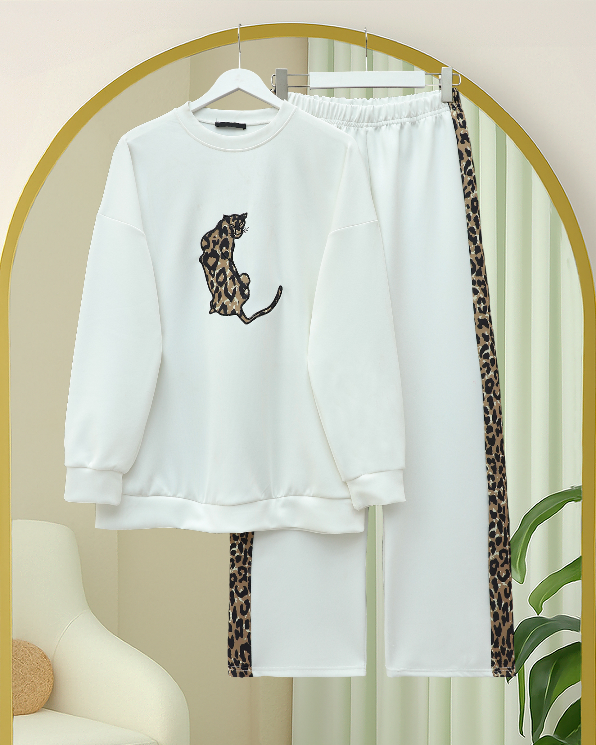 Leopar Figürlü Ve Desenli Pantolonlu Scuba Takım -Beyaz-Beyaz