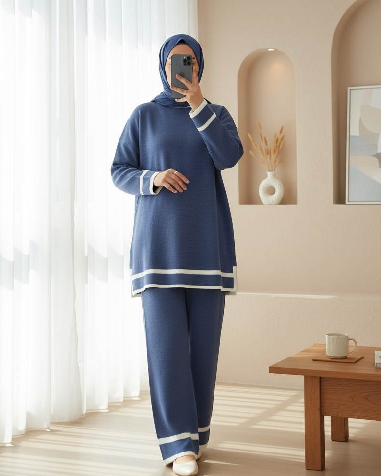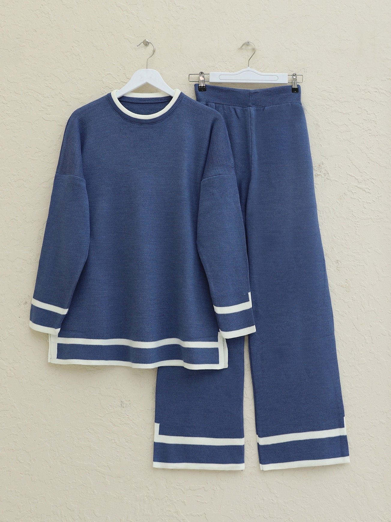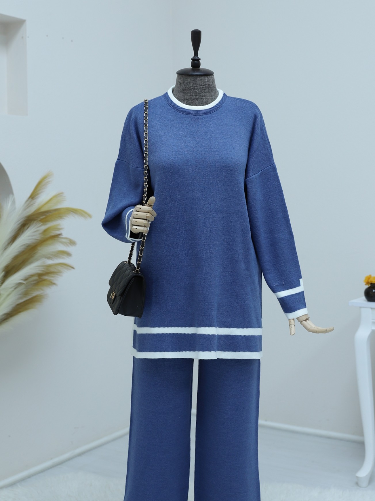 Manşetleri Şeritli İkili Triko Takım -İndigo-İndigo
