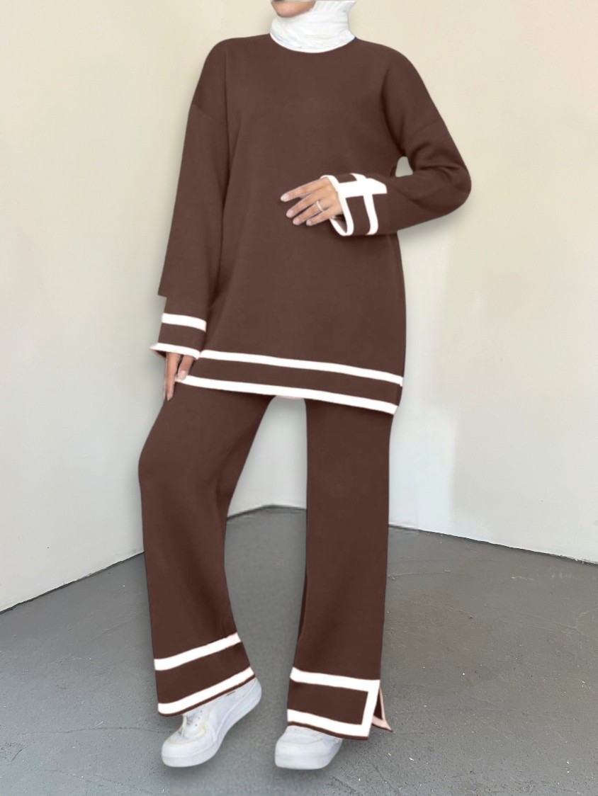 Manşetleri Şeritli İkili Triko Takım -Kahve-Kahve