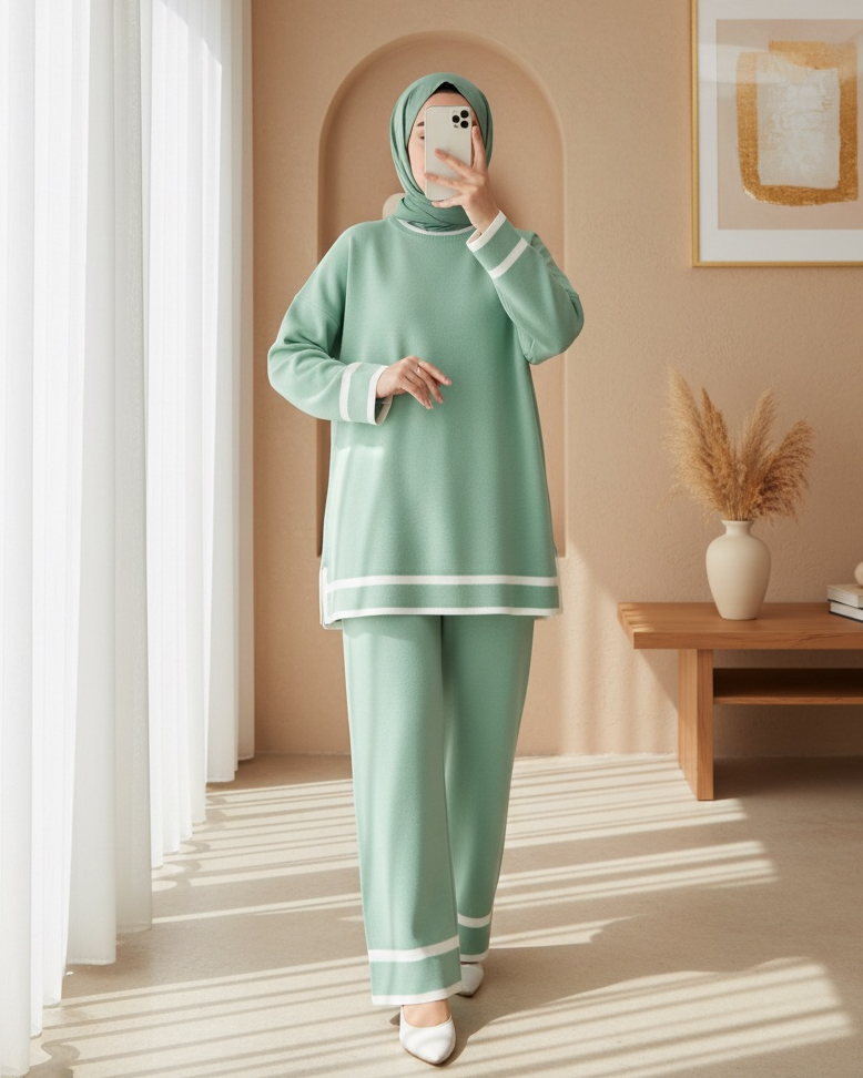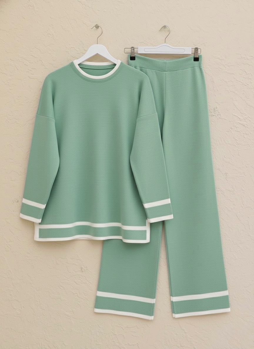 Manşetleri Şeritli İkili Triko Takım -Su Yeşili-Su Yeşili