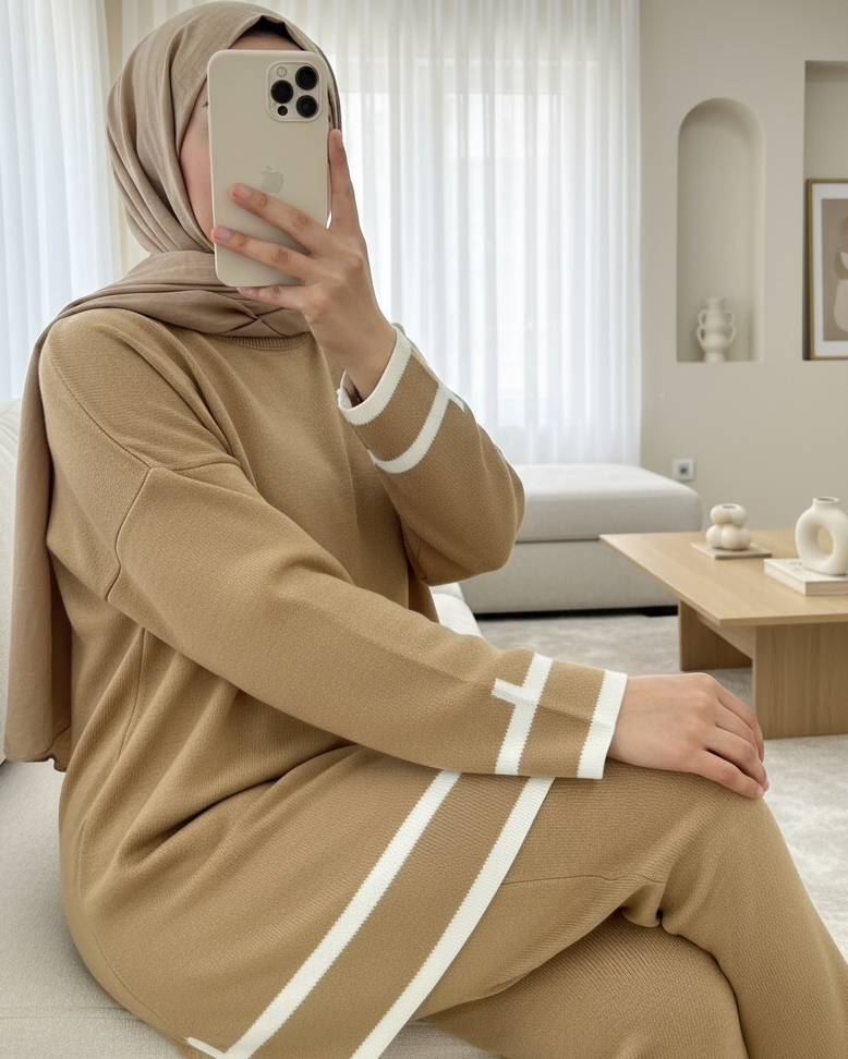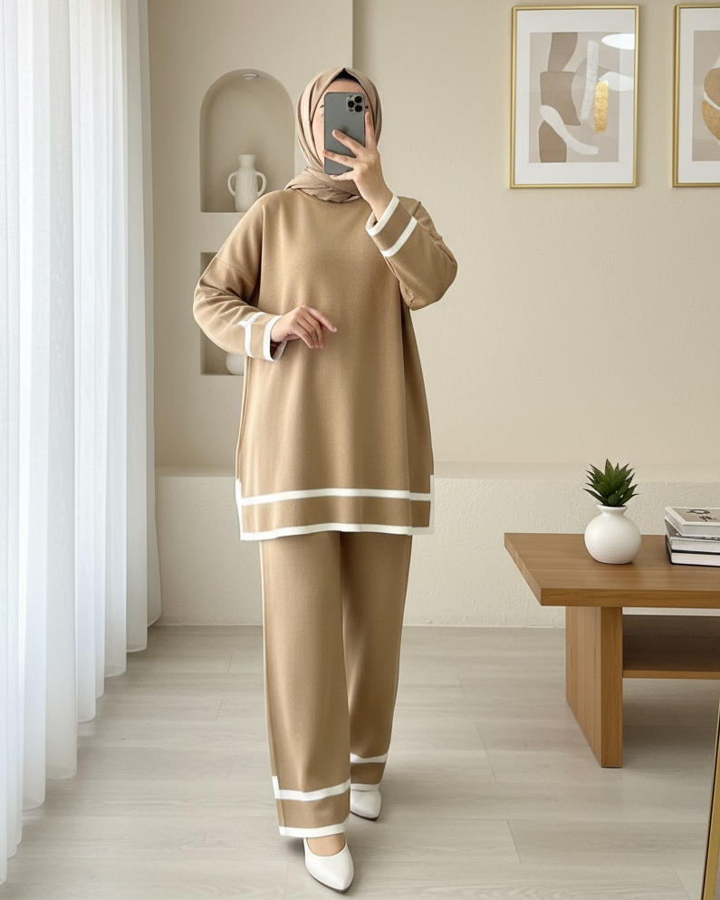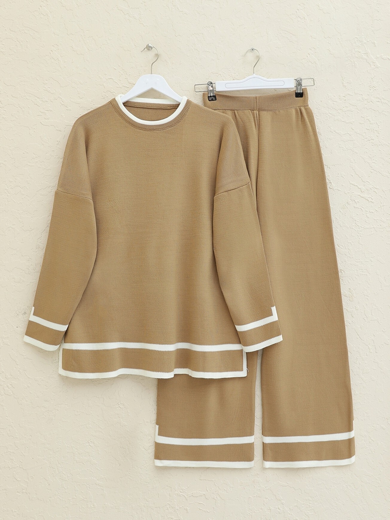 Manşetleri Şeritli İkili Triko Takım -Taba-Taba