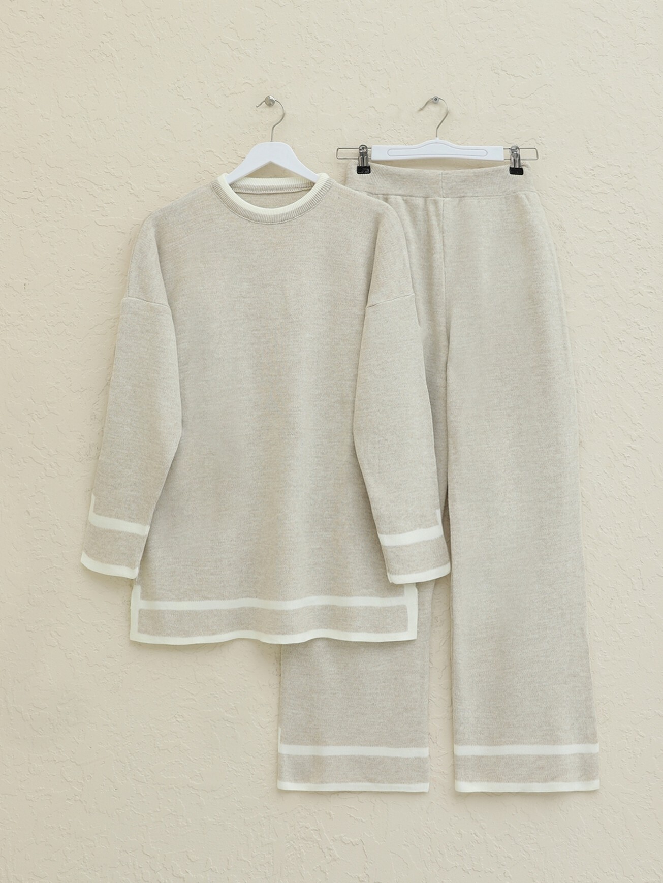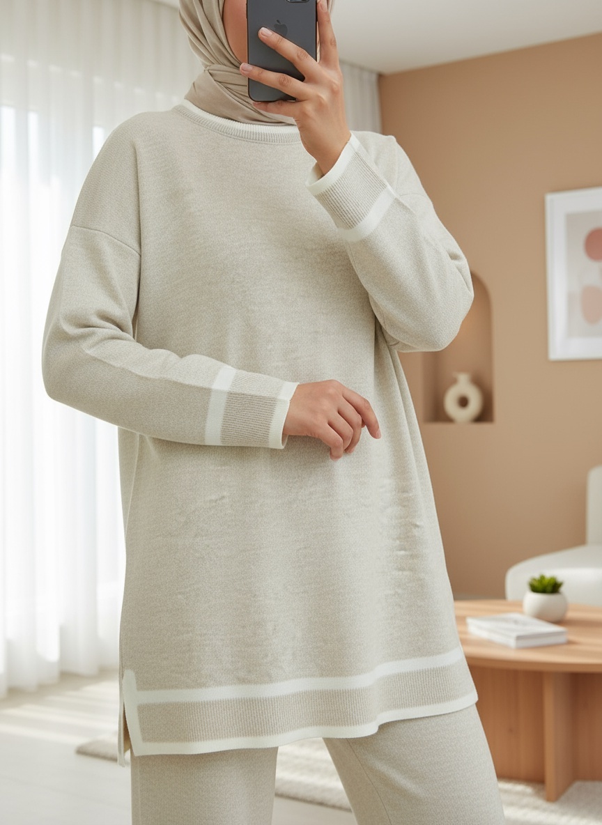 Manşetleri Şeritli İkili Triko Takım -Taş-Taş