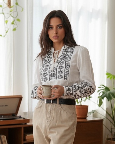 Manşetli Nakış İşlemeli Bağcık Detaylı Bluz -Beyaz-Beyaz