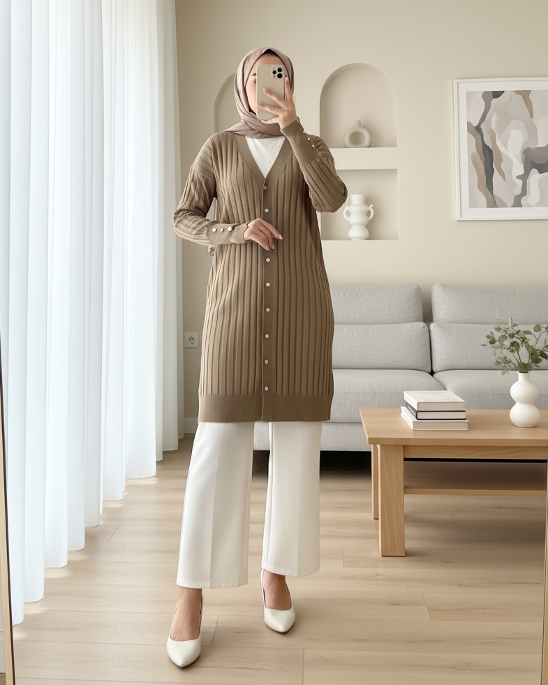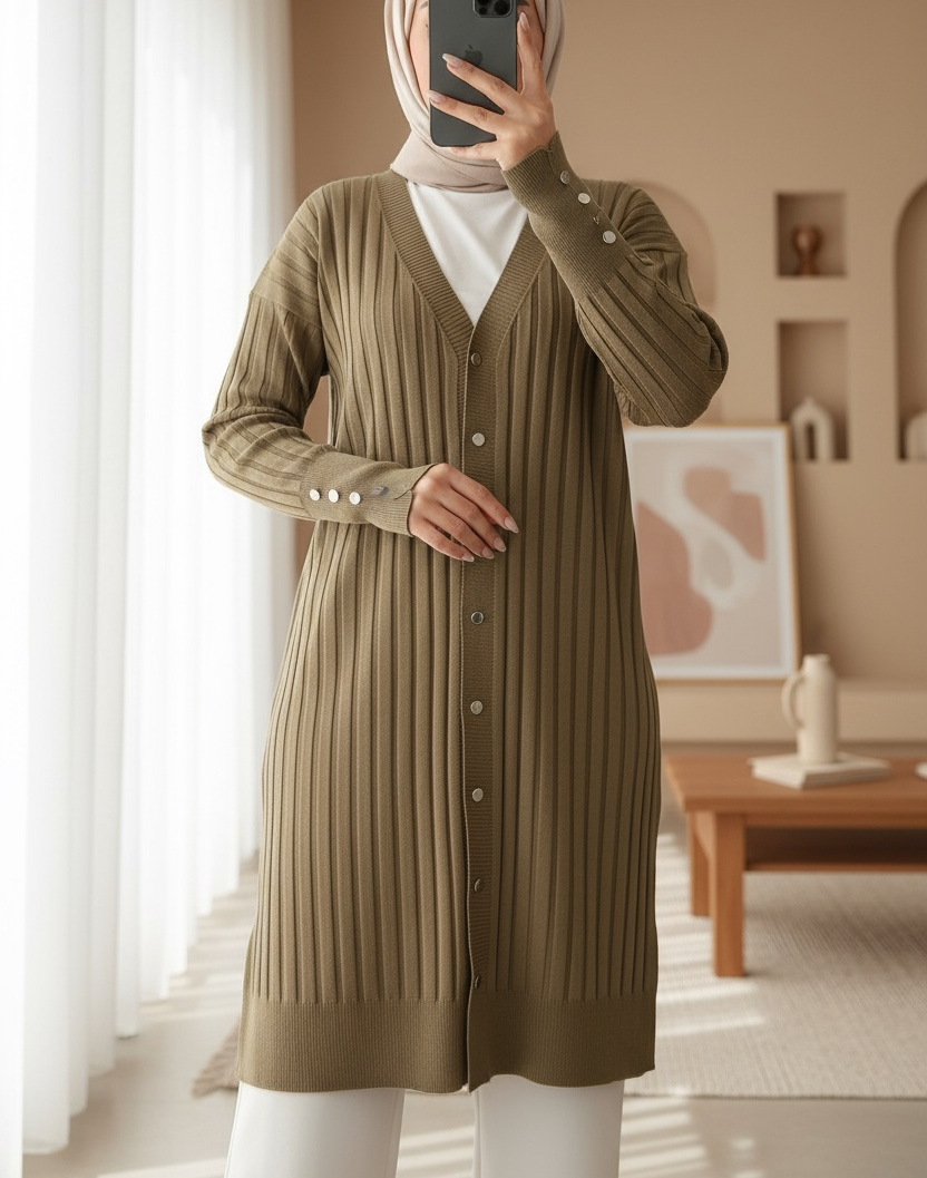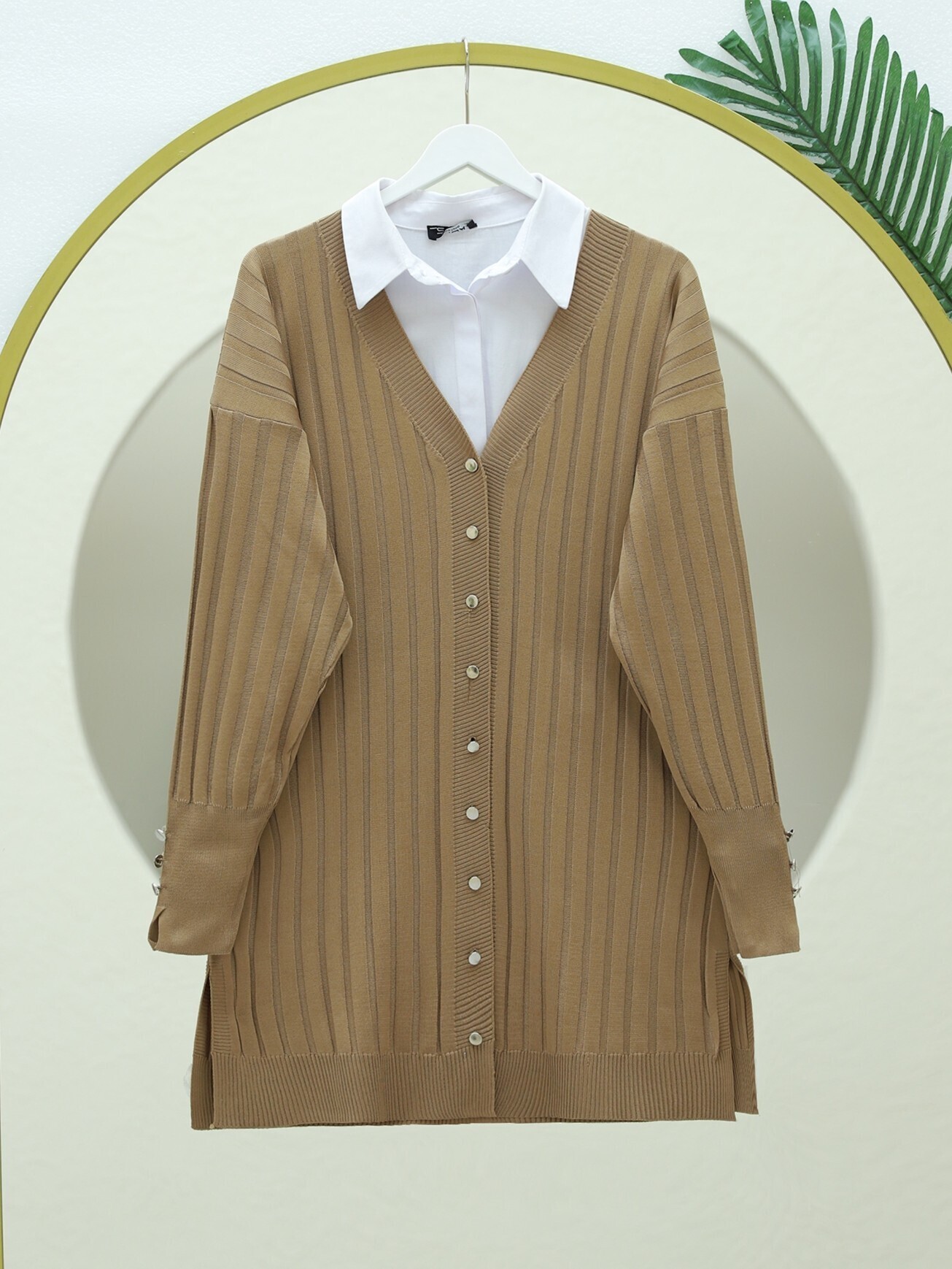 Metal Düğmeli Yırtmaçlı Triko Hırka -Vizon-Vizon