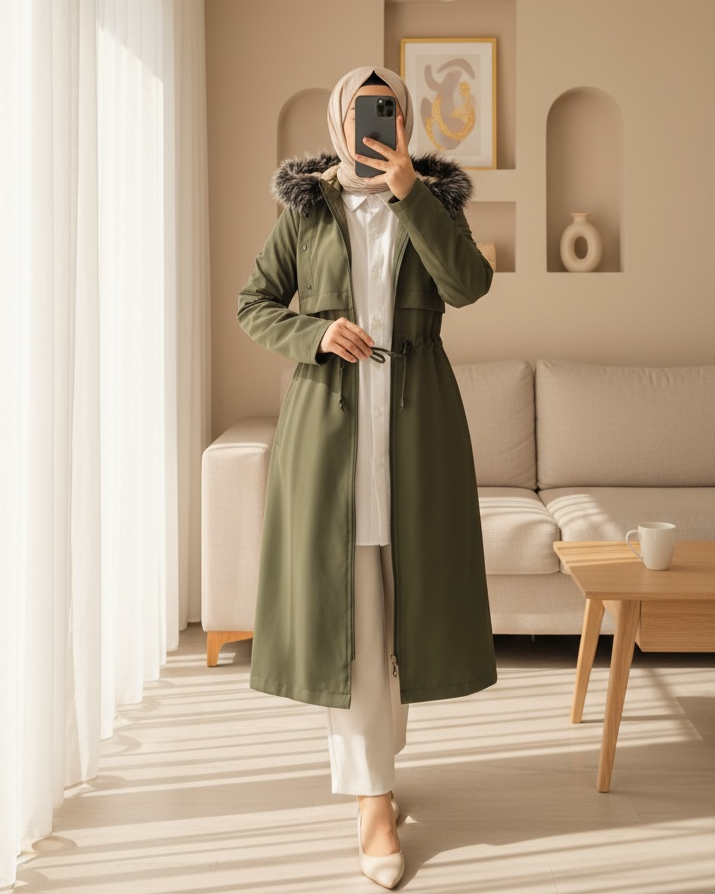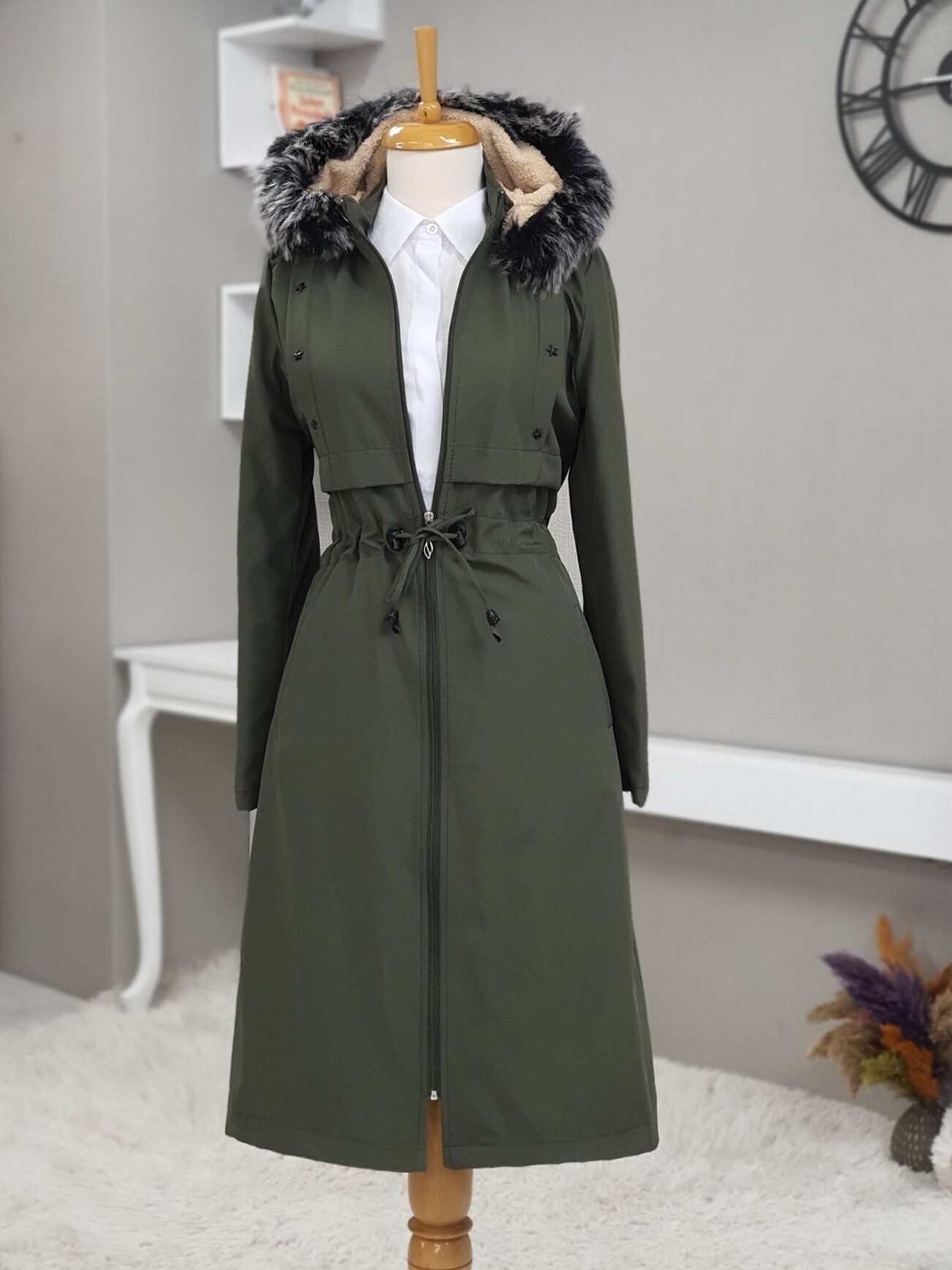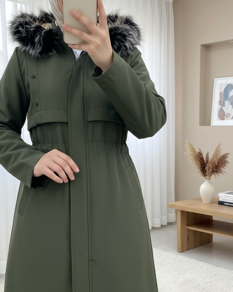 Metal Yıldız Detaylı Kapşonlu Uzun Kaban -Haki-Haki