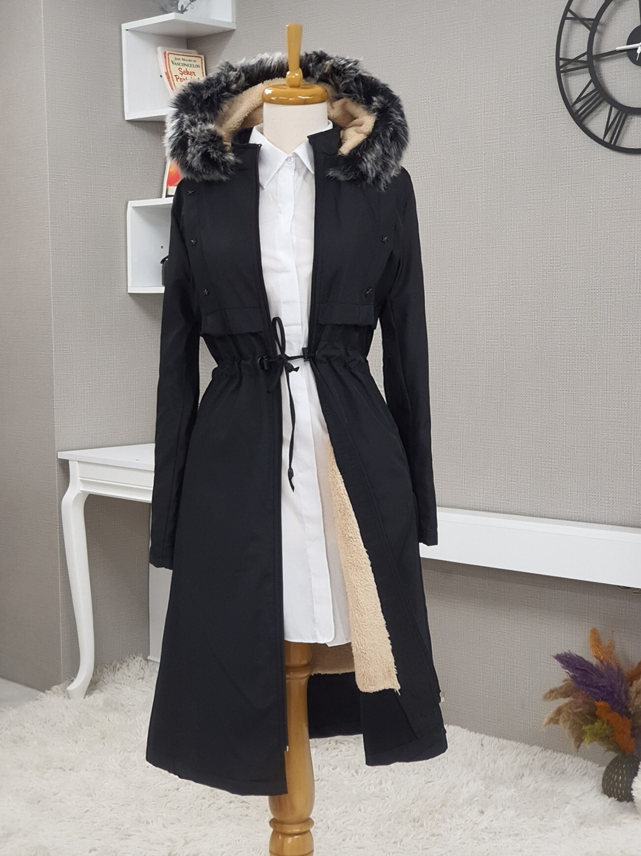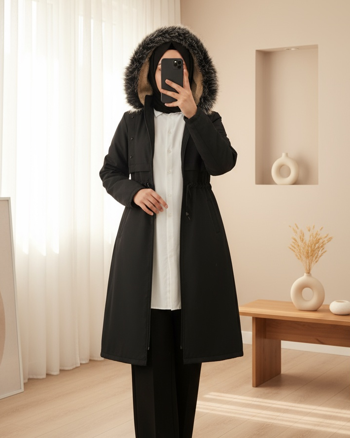 Metal Yıldız Detaylı Kapşonlu Uzun Kaban -Siyah-Siyah