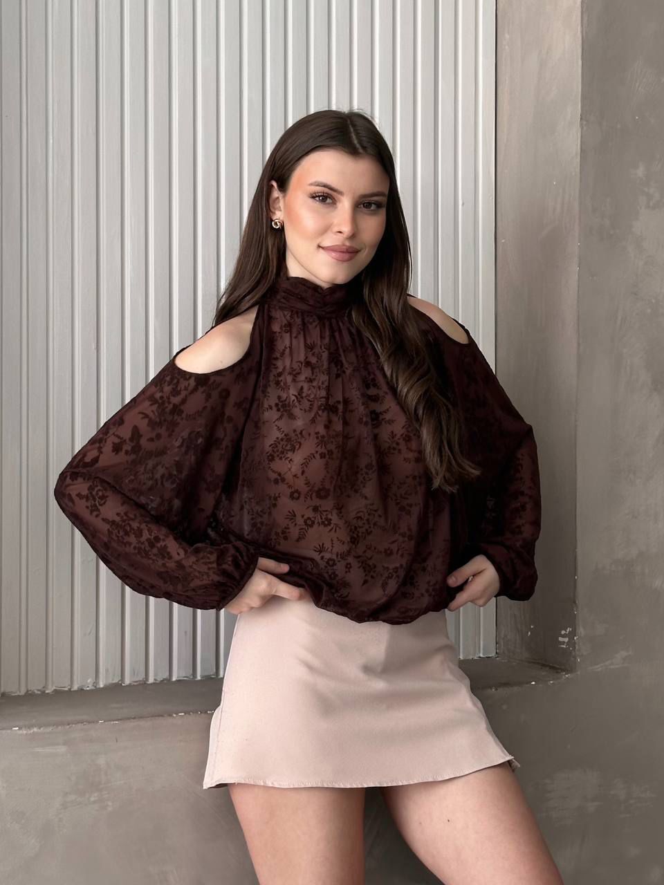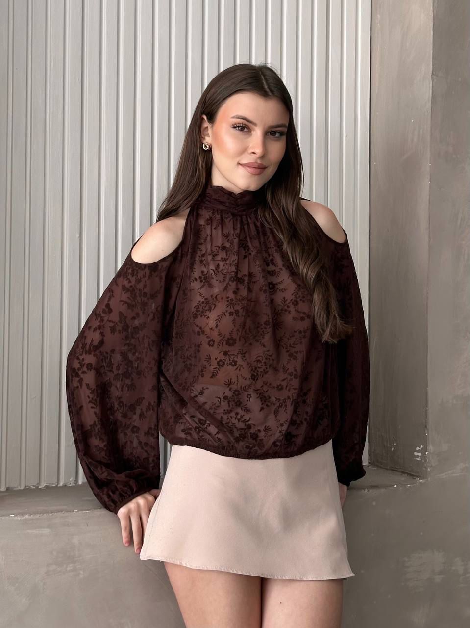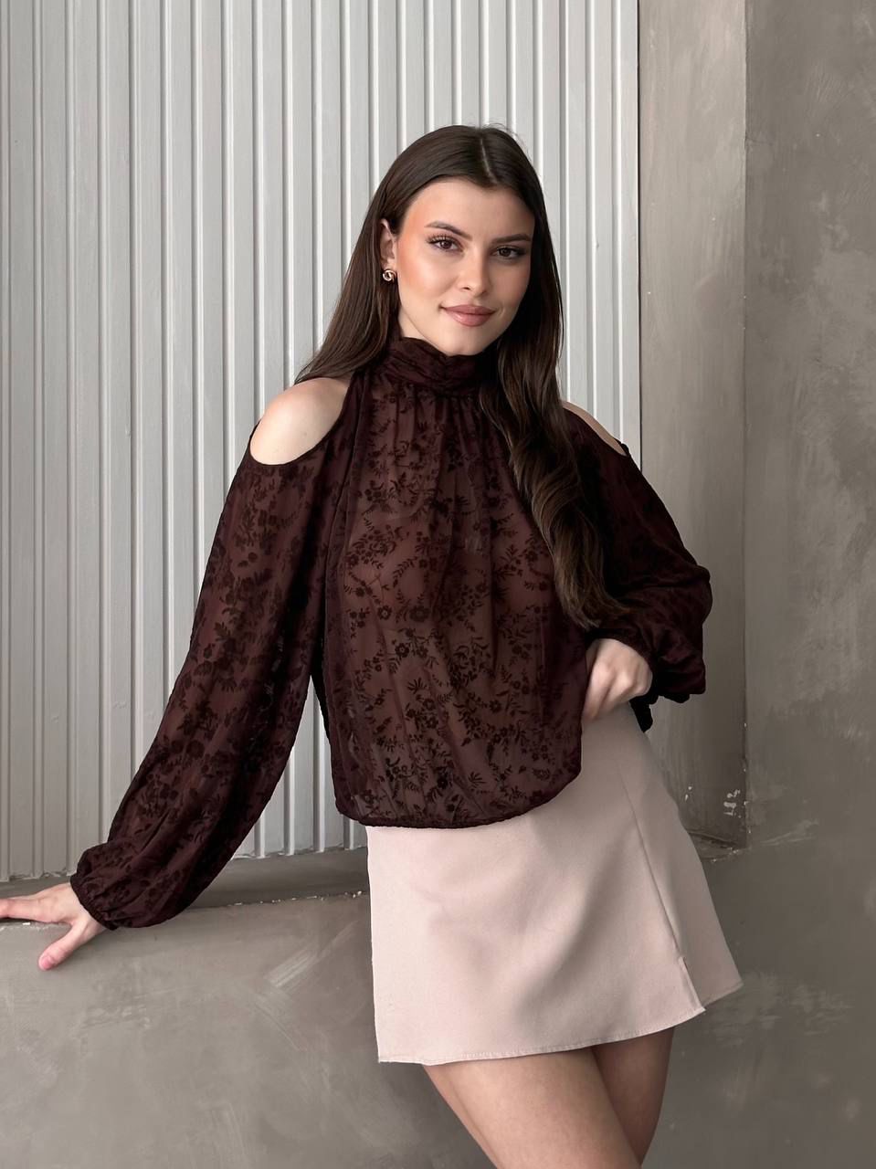 Omuz Detaylı Tül Bluz Kahve - 4180-Kahve