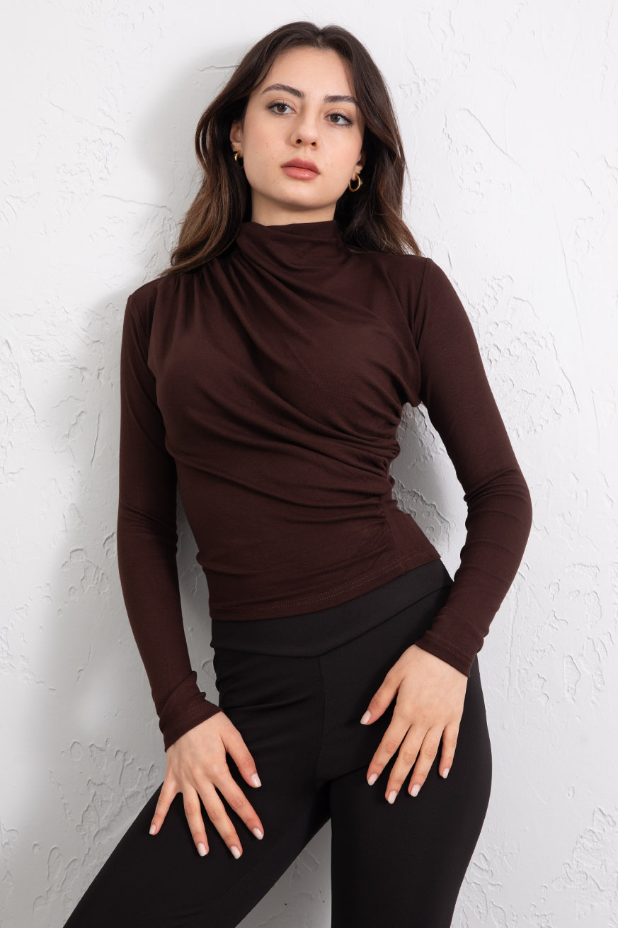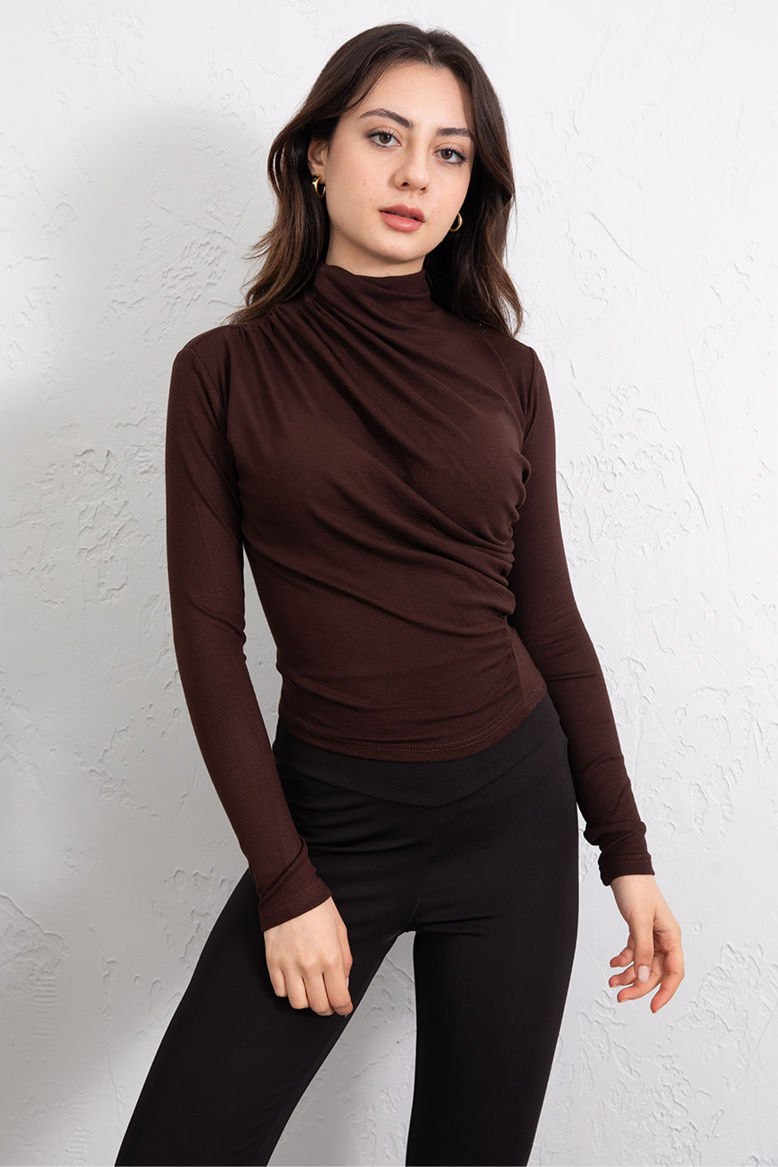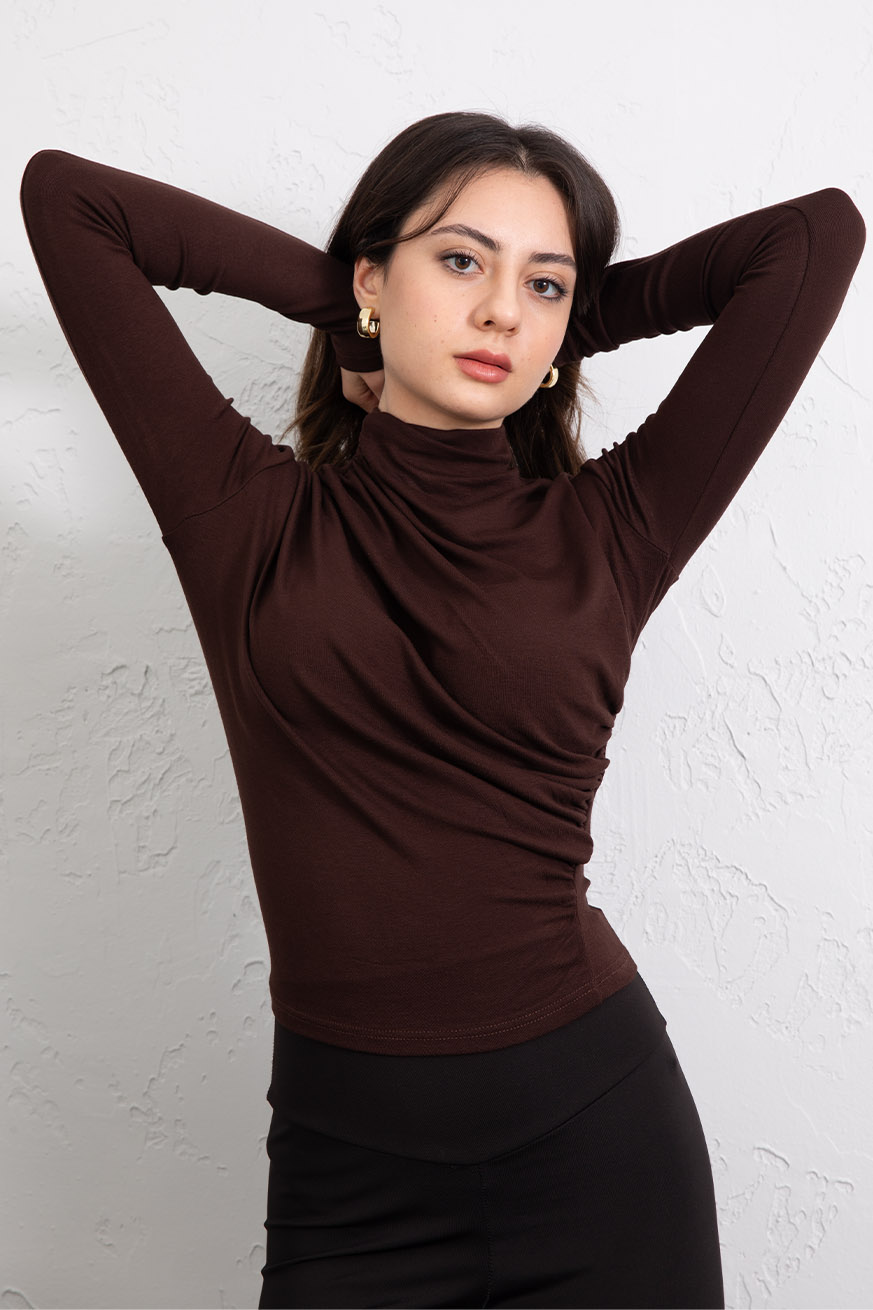 Omuz ve Yanı Büzgülü Ribanalı Bluz Kahve - 5151-Kahve